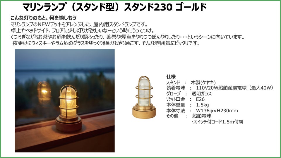 その傍ら、漁船に使用されている船舶用照明をアレンジして一般の家庭や店舗のインテリア、エクステリアとしても使用できる「マリンランプ 」として販売することで船の灯りの魅力を発信し全国にファンを増やしてきました。