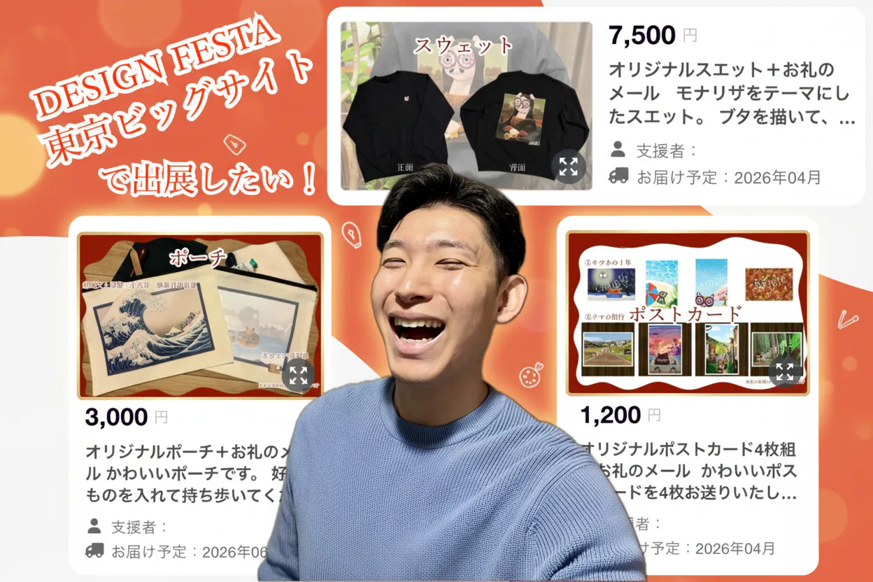 2026/03/06 18:00新しく開催しました【東京ビッグサイトでの展示!デザインフェスタvol.63で沢山の人に見てほしい!】に関しましてご覧いただけましたでしょうか?今回は、本当に沢山のリターンをご用意し、お楽しみいただける商品を販売しております。下は一部ではございますが、ご紹介させて頂きたく、ご連絡いたしました。またそのほかにも沢山のリターンご用意しておりますので、是非ご覧ください!!ぜひ下のリンクからお願いします。リンクはこちらから!オリジナルスエット+お礼のメール モナリザをテーマにしたスエット。ブタを描いて、日常使いしやすいデザインにしました。デザフェス前のお届けになりますので、本スエットを着用してデザフェスへ行こう!オリジナルポーチ+お礼のメール かわいいポーチです。好きなものを入れて持ち歩いてくださいなどして楽しんでください。 ①柴犬と冨嶽三十六景 神奈川沖浪裏②カピバラ温泉オリジナルポストカード4枚組+お礼のメール かわいいポストカードを4枚お送りいたします。 是非、家に飾るなり、ご友人やご家族へメッセージを送るなどして楽しんでください。 ①キツネの一年②クマの旅行ぜひ温かいご支援のほどよろしくお願いします もっと見る新クラウドファウンディング開催!:東京ビッグサイトでの展示!デザインフェスタvol.63で沢山の人に見てほしい!