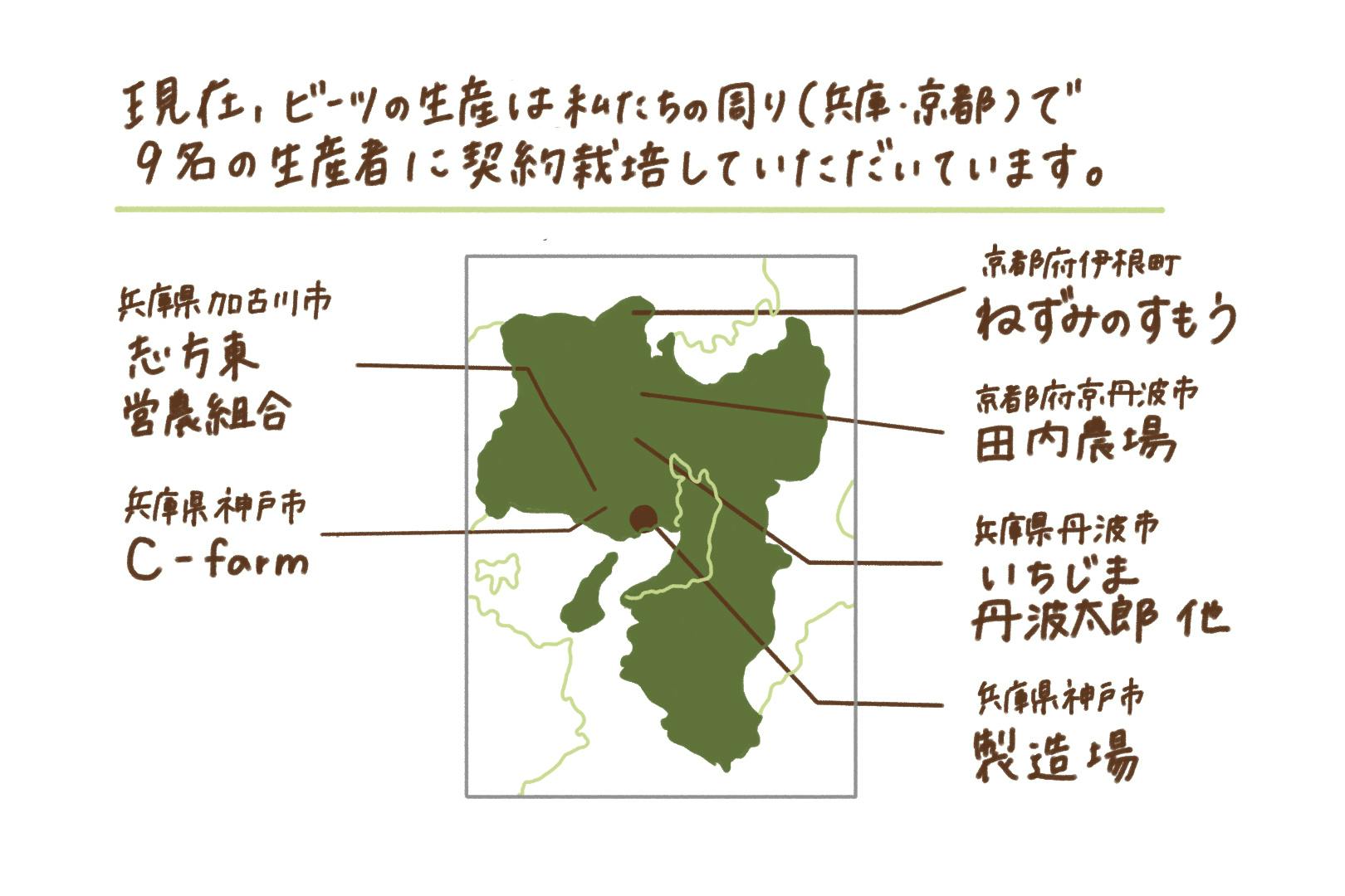 現在、関西圏(兵庫県、京都府)で9名の生産者の方々にビーツの栽培をしていただいております。安心して食べられる美味しいビーツであることはもちろんのこと、土壌・水質汚染、動植物や微生物等の生態系への悪影響を及ぼさないよう有機栽培もしくは、栽培期間中農薬不使用で生産しています。言うのは、簡単ですが、農薬や除草剤を使わないとなると、雑草との戦いで、除草が本当に大変な上、化学肥料を使わないことで、思ったより大きなサイズにならないといったこともあります。そういった一つ一つのことを共に乗り越えながら、生産者や栽培環境に寄り添い、生産者同士のビーツの栽培技術の意見交換を行い、持続的なビーツの生産に向けて、取り組んでいます。種は栽培前に、こちらから提供し、収穫できたビーツは全量買取を行う契約栽培で、これからも美味しいビーツを畑からみなさんの元へお届けしています。水煮では、どの生産者のビーツを利用しているかを記載していますので、ぜひチェックしてみてください!