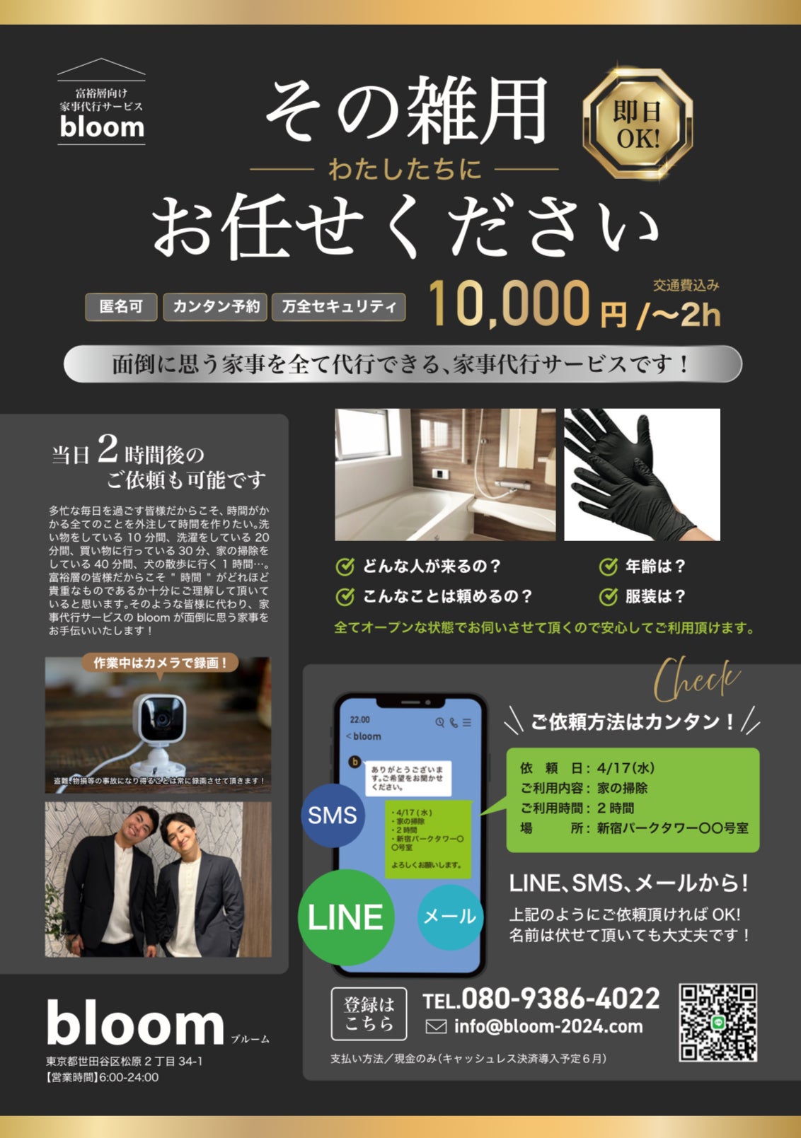LINE、SMS、メールの3つからご自由にお選び下さい。下記例の様にご依頼頂ければok!名前は伏せて頂いても大丈夫です!当日2時間後のご依頼も可能です☆