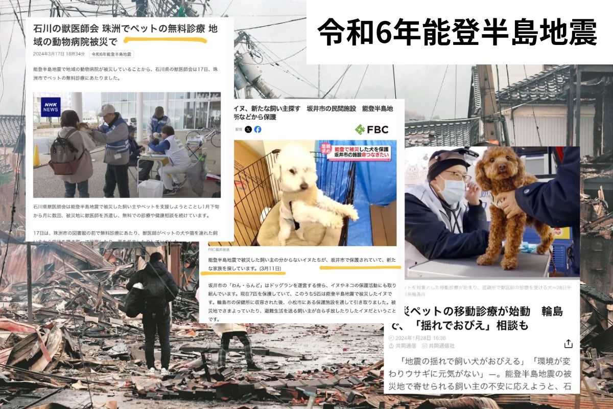 2024年1月1日16:10 石川県の能登半島を襲った最大震度7の大地震「令和6年能登半島地震」は現在までに、死亡・行方不明者293名、負傷者1,323名という甚大な被害となりました。また住家の被害状況も、全壊から一部破損までを含め125,976棟とあまりにも多く、半年以上経った今も被害地域の復興には時間を要しています。(※数値情報:消防庁6月25日14:00時点)これだけ大きな災害であれば、共に暮らす犬たちがどれほどの被害を受けたのか...正直、計り知れません。私自身、災害発生から今日まで、能登半島地震の犬たちに関する様々な情報を出来る限り収集集約し、Instagramへまとめて発信してまいりました。その中で、国、行政、自治体、獣医師会、愛護センター等...様々な立場の動きをリアルに感じてきました。だからこそ本災害時に感じた犬を守る防災の現状と課題に対し、「今後を見据えて、今こそ備える必要がある!」と思い行動を起こすことにしました。