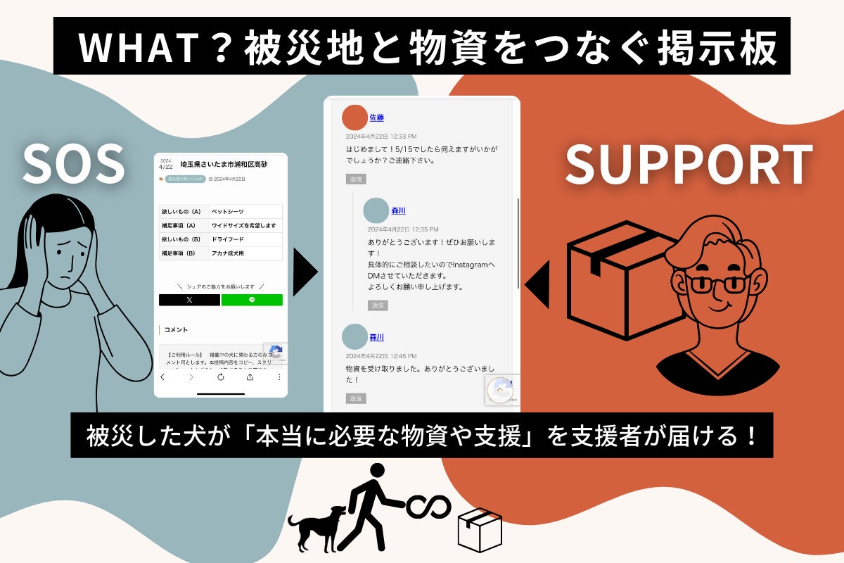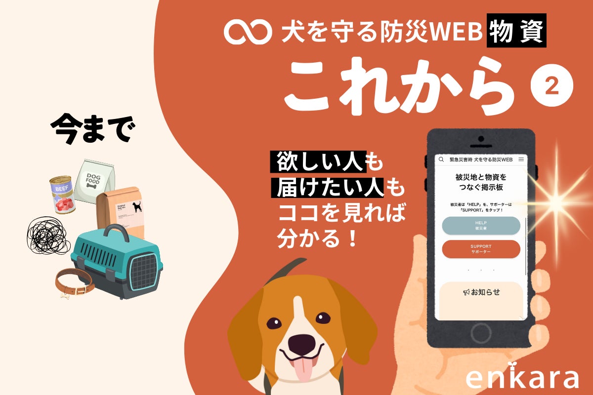 2024/11/14 16:36日本全域の地震、風水害など緊急災害時にすぐ機能する”被災地の犬と飼い主をサポートするWEBサイト”と”犬を守る新しい防災文化”を実装した『緊急災害時 犬を守る防災WEBプロジェクト』を、クラウドファンディングご支援のもと新たにリリースいたしました!本WEBサイトの先行機能は「災害時に放浪する迷い犬を捜索・発見する機能」と「物資を被災犬へ繋ぐ機能」です。2024年12月20日(金)まで、どなたでも自由にご覧いただける試験運用期間をスタートし、実際にご使用いただいたユーザーの声をアンケート抽出、その後アップデートし、正式リリースへ繋げてまいります。【緊急災害時 犬を守る防災WEB】https://emergency.enkara.jp/【ユーザーアンケートフォーム】https://forms.gle/sHAee1KJnaewZucm8災害迷い犬と物資支援、2つの課題解決に挑戦!日本全域の地震、風水害など緊急災害時にすぐ立ち上がり機能する被災地の犬と飼い主をサポートするWEBサイトには、2つのメイン機能があります。先行機能として、一次支援に必要な機能のみに絞りました。(1)「迷い犬掲示板」・・・災害時に放浪する迷い犬を捜索・発見する機能迷い犬捜索《解決!飼い主さんが探している迷い犬と、放浪している犬を見かけた人の情報を1つに》SNSに頼らない迷い犬の捜索と情報の一本化を目指します!SNSはあくまでも情報拡散に適したツールです。その特性は活かしつつ、「迷い犬専門サイト」への情報の集約が、迷い犬と飼い主さんを一刻も早く繋ぐものになります!”放浪している犬”を見かけた地域の人が誰でも簡単に使えること。見つけた人の視点に立った分かりやすい仕組みであることも本WEBサイトの特徴です!(2)「被災地と物資をつなぐ掲示板」・・・被災した犬へ必要な支援物資をつなげる機能物資支援《解決!被災者が愛犬に必要なものを投稿し、ピンポイントでそのサポートを届ける!》実際にライフラインが寸断されている中でも、物資を積んで現地へ支援に行かれたボランティアサポーターも多くいらっしゃいました。その方たちが被災者のリアルな情報やニーズをキャッチする場としても、安心してご利用していただけるよう運営することが重要です。貴重なリソースを最大化し、確実に被災地の悩みやお困りごとにアプローチする仕組みをつくります!目指す未来像災害が起こった際、すぐに運用と運営をスムーズに行うために最も重要なことは事前準備です。テスト運用を定期的に行うことで盤石にし、有事の際、すぐに使える仕組みを目指します!そのため定期的に有事を想定した『オンライン防災訓練』を実施し、ご自身が被災した立場や、被災者を支援する立場をリアルに体験していただきます。本プロジェクトの最大のポイントは、普段犬との関わりが無い方からも情報共有を積極的に受ける流れを作ることです。日本に暮らす人たちの「放浪している犬がいる・・・どうしよう」から、その先の行動変化を具体的に起こす文化醸成が本プロジェクトで最も実現したいことの1つです。このプロジェクトは、日本に住むすべての人に関わる問題!最新データでは、全国の犬の飼育頭数は約684万頭と推計されており、日本総人口1億2400万人の約10.4%の家庭が犬を飼育しているとされています。(参考:一般社団法人ペットフード協会2023年統計数値、総務省統計数値2024年4月時点)日本全域で考えた時、必ず全ての地域で犬と暮らす家庭があり、どこで災害が起きても家庭で暮らす犬たちの課題に全ての人たちが直面します。だからこそ、日本全域でゆるやかに繋がり、家庭で暮らす犬と飼い主の日常を支えるWEBサイトを立ち上げ運用することで、社会全体のご協力をいただきこの課題を解決していきたいと考えています。WEBサイトが出来たら完成!ではありません。本WEBサイトをどのように周知し、確実に使えるものにしていくのか?そこには大きな山があるでしょう。でも、その山こそ今、日本に住む犬と飼い主さんが置かれている現状を大きくチェンジするキーになります!何より犬たちのために・・・必ず文化となるよう的確に動き続けてまいります!enkara もっと見る