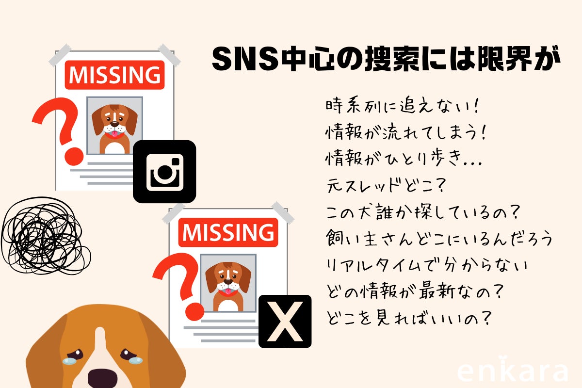 地震発生時から各SNSで行方不明犬を捜索する情報が溢れて錯綜し、SNSの特徴として多様な情報が流れ、『捜索中の犬が見つかったのか』、『どの犬が現在行方不明なのか』リアルタイムで確実な情報を知る術がありませんでした。誰かが情報を一時的にまとめても、状況は常にアップデートされ続け、時系列で追えない問題は、今後の日本における様々な災害を想定した時、災害時の愛犬捜索をSNSへ頼ることについて限界を感じ、同時に大きな不安を抱きました。「災害が都心部で起きた時、迷い犬が多すぎてパニックになるのではないか?」