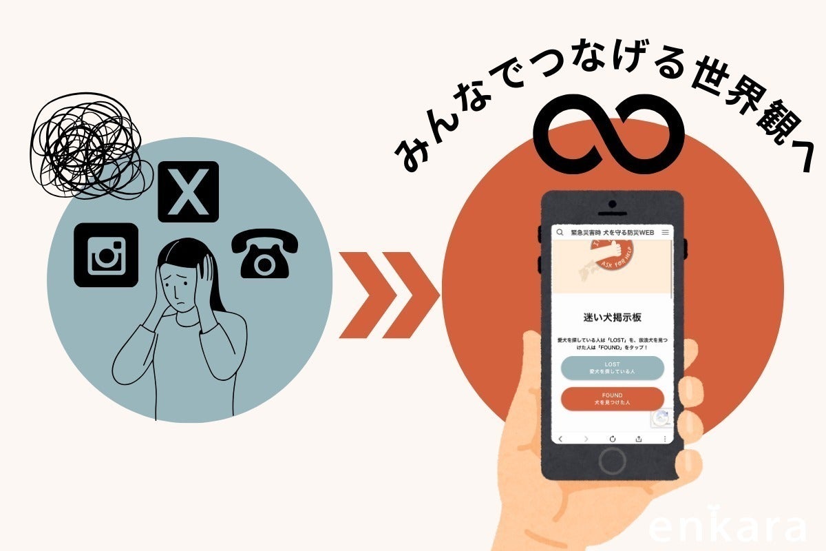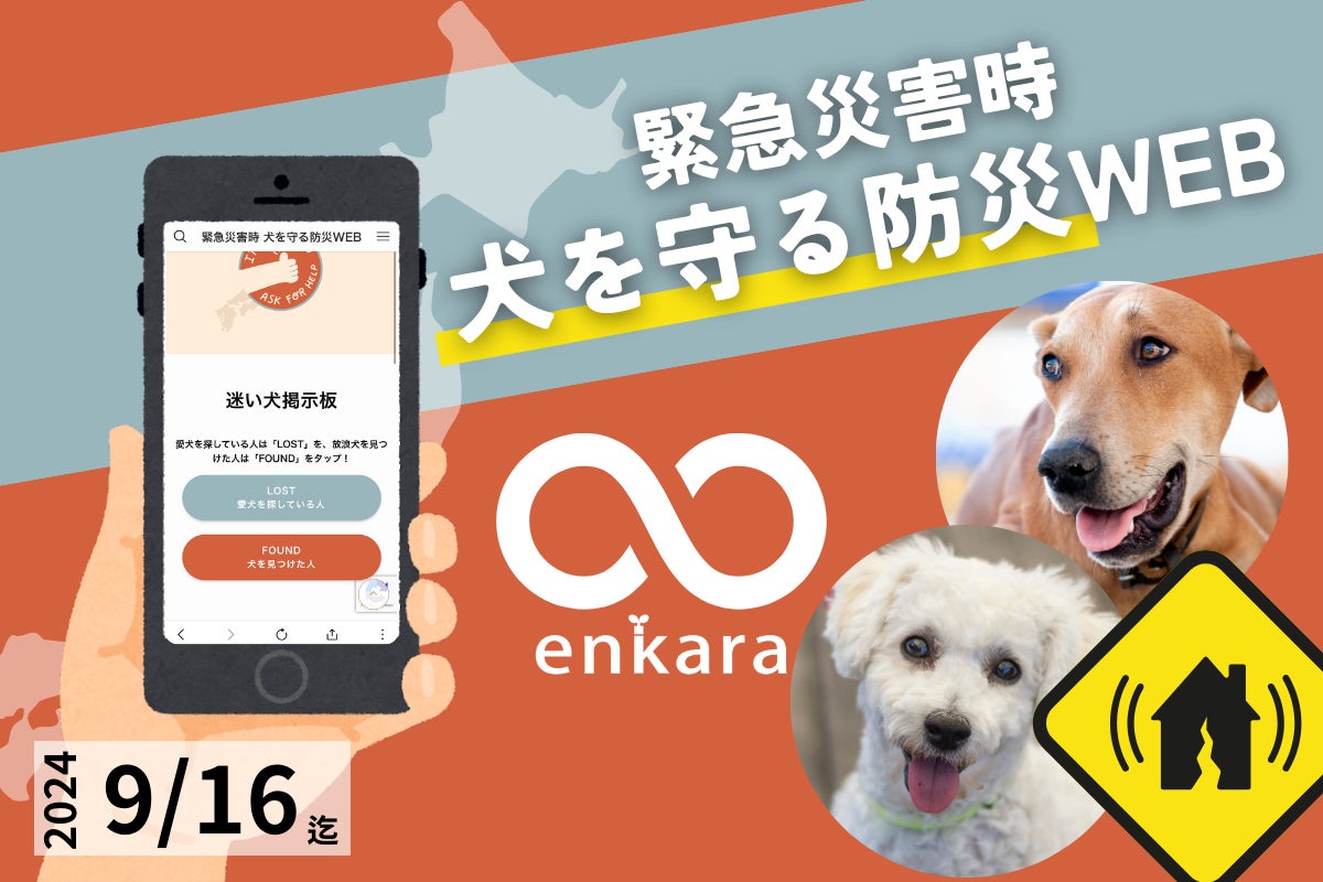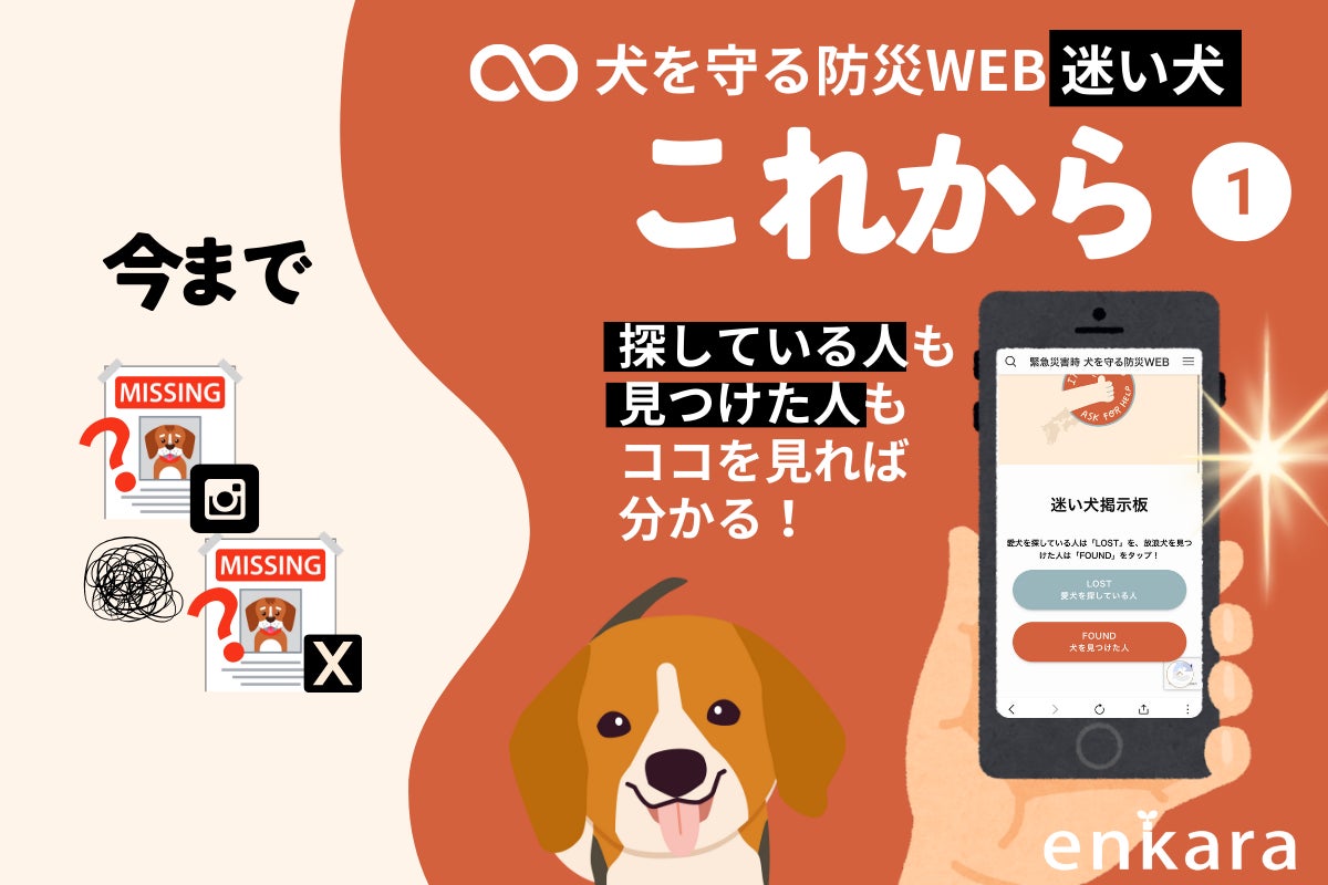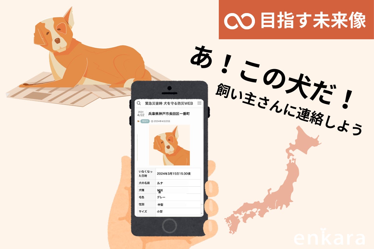 2024/11/14 16:36日本全域の地震、風水害など緊急災害時にすぐ機能する”被災地の犬と飼い主をサポートするWEBサイト”と”犬を守る新しい防災文化”を実装した『緊急災害時 犬を守る防災WEBプロジェクト』を、クラウドファンディングご支援のもと新たにリリースいたしました!本WEBサイトの先行機能は「災害時に放浪する迷い犬を捜索・発見する機能」と「物資を被災犬へ繋ぐ機能」です。2024年12月20日(金)まで、どなたでも自由にご覧いただける試験運用期間をスタートし、実際にご使用いただいたユーザーの声をアンケート抽出、その後アップデートし、正式リリースへ繋げてまいります。【緊急災害時 犬を守る防災WEB】https://emergency.enkara.jp/【ユーザーアンケートフォーム】https://forms.gle/sHAee1KJnaewZucm8災害迷い犬と物資支援、2つの課題解決に挑戦!日本全域の地震、風水害など緊急災害時にすぐ立ち上がり機能する被災地の犬と飼い主をサポートするWEBサイトには、2つのメイン機能があります。先行機能として、一次支援に必要な機能のみに絞りました。(1)「迷い犬掲示板」・・・災害時に放浪する迷い犬を捜索・発見する機能迷い犬捜索《解決!飼い主さんが探している迷い犬と、放浪している犬を見かけた人の情報を1つに》SNSに頼らない迷い犬の捜索と情報の一本化を目指します!SNSはあくまでも情報拡散に適したツールです。その特性は活かしつつ、「迷い犬専門サイト」への情報の集約が、迷い犬と飼い主さんを一刻も早く繋ぐものになります!”放浪している犬”を見かけた地域の人が誰でも簡単に使えること。見つけた人の視点に立った分かりやすい仕組みであることも本WEBサイトの特徴です!(2)「被災地と物資をつなぐ掲示板」・・・被災した犬へ必要な支援物資をつなげる機能物資支援《解決!被災者が愛犬に必要なものを投稿し、ピンポイントでそのサポートを届ける!》実際にライフラインが寸断されている中でも、物資を積んで現地へ支援に行かれたボランティアサポーターも多くいらっしゃいました。その方たちが被災者のリアルな情報やニーズをキャッチする場としても、安心してご利用していただけるよう運営することが重要です。貴重なリソースを最大化し、確実に被災地の悩みやお困りごとにアプローチする仕組みをつくります!目指す未来像災害が起こった際、すぐに運用と運営をスムーズに行うために最も重要なことは事前準備です。テスト運用を定期的に行うことで盤石にし、有事の際、すぐに使える仕組みを目指します!そのため定期的に有事を想定した『オンライン防災訓練』を実施し、ご自身が被災した立場や、被災者を支援する立場をリアルに体験していただきます。本プロジェクトの最大のポイントは、普段犬との関わりが無い方からも情報共有を積極的に受ける流れを作ることです。日本に暮らす人たちの「放浪している犬がいる・・・どうしよう」から、その先の行動変化を具体的に起こす文化醸成が本プロジェクトで最も実現したいことの1つです。このプロジェクトは、日本に住むすべての人に関わる問題!最新データでは、全国の犬の飼育頭数は約684万頭と推計されており、日本総人口1億2400万人の約10.4%の家庭が犬を飼育しているとされています。(参考:一般社団法人ペットフード協会2023年統計数値、総務省統計数値2024年4月時点)日本全域で考えた時、必ず全ての地域で犬と暮らす家庭があり、どこで災害が起きても家庭で暮らす犬たちの課題に全ての人たちが直面します。だからこそ、日本全域でゆるやかに繋がり、家庭で暮らす犬と飼い主の日常を支えるWEBサイトを立ち上げ運用することで、社会全体のご協力をいただきこの課題を解決していきたいと考えています。WEBサイトが出来たら完成!ではありません。本WEBサイトをどのように周知し、確実に使えるものにしていくのか?そこには大きな山があるでしょう。でも、その山こそ今、日本に住む犬と飼い主さんが置かれている現状を大きくチェンジするキーになります!何より犬たちのために・・・必ず文化となるよう的確に動き続けてまいります!enkara もっと見る