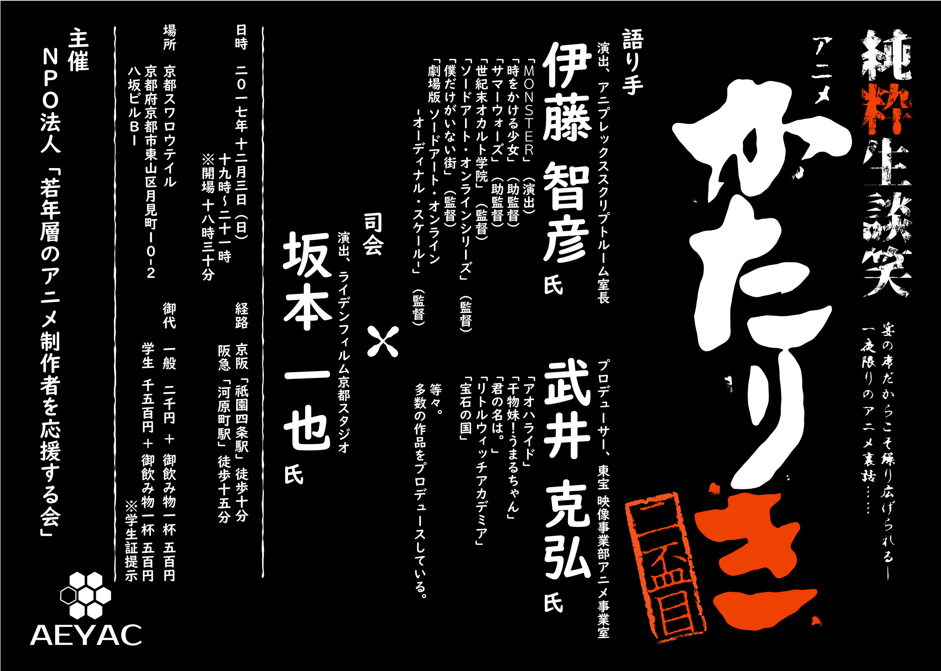 現在、私たちAEYACに所属する京都大学の学生を中心に、11月25日(日)に京都大学11月祭にてアニメ制作会社スタジオコロリドの創業者・宇田英男氏、監督・石田祐康氏をお招きし、「アニメーションスタジオの可能性」をテーマに講演会の開催を企画しています。