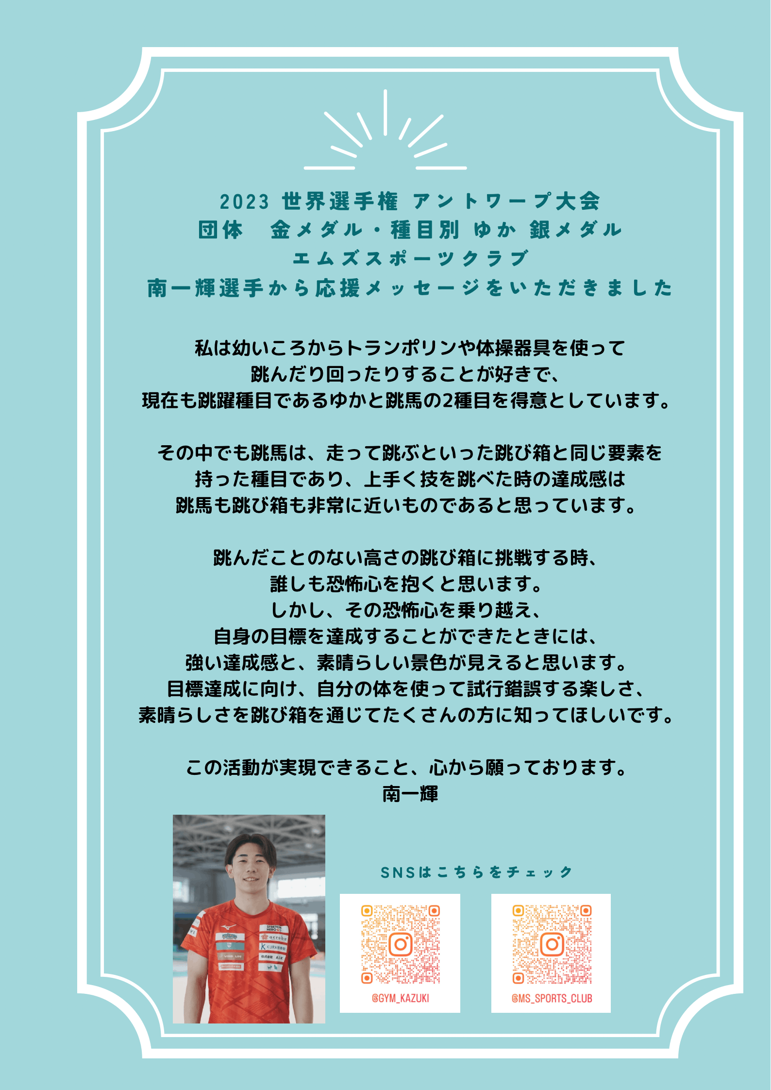 ▼南一輝選手(2023 世界選手権アントワープ大会 団体金メダル・種目別ゆか銀メダル/エムズスポーツクラブ)