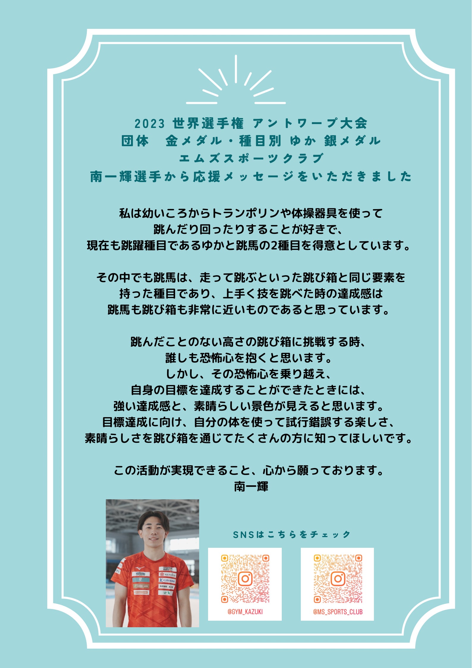 ▼南一輝選手(2023 世界選手権アントワープ大会 団体金メダル・種目別ゆか銀メダル/エムズスポーツクラブ)