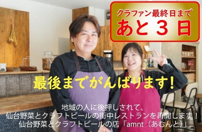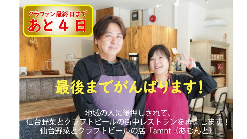 仙台野菜とクラフトビールの店amnt(あむんと)のまいです。皆さま、今日はとうとう新店舗オープンしてからずっと並走してきたわたしたちのクラウドファンディングの最終日です。この期間はとてもとても充実した日々でした。活動報告として皆さまにもっといろいろお伝えして来れたらよかったなあとか、もっとわたしたちの気持ちを伝えられる方法があったんじゃないかなあとか…思い返すと反省してしまいます。初めてのクラウドファンディング挑戦でうまくできていないことが多かったと思います。たくさん伝えたい思いがありました。仙台フォーラスの長期休業により、お店を閉店せざるを得なくなったあと、今のこのamntをこの場所でオープンできたこと。様々なご縁や、あたたかい皆さまの応援のおかげで、今わたしたちがこのお店で皆さまをお迎えできること。本当に奇跡にも感じます。心からありがとうございます。これから先もこのクラウドファンディングをご支援してくださったamntの仲間の皆さまにいつまでもいつまでも好きでいてもらえるお店でいられるよう、わたしたちは常により良いお店作りのために努力してまいります。※amntに集まっていただいて応援していただいているお客様と共に撮影最後にわたしはみんなのことが大好きです。これからもこんな未熟なまいのことをご指導してください。わたしは皆さまに少しでも楽しい、ほっとする、癒される~。と思ってもらえるような空間を作り、いつでもamntで皆さまをお待ちしております。クラウドファンディング最終日。残りの時間も最後の最後までがんばります!応援、どうぞよろしくお願いいたします!