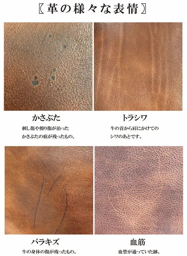 本革には合成皮革にはない牛が生きていた証の印があります。元々の素材を生かした仕上げの為、その牛が持っていたキズ、シワ、血管、毛穴などの刻印がよくみられるのが特徴です。これらは身体の部位や個体差で一つ一つ表情が異なる。世界に2つとない自分だけの特別な革をじっくりとご覧ください。