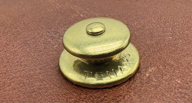 金具(ホック、カシメ、底鋲など)には革と共に経年変化(エイジング)する真鍮を採用。
