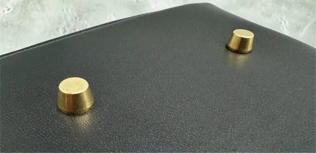 底に付いている底鋲は、擦れを軽減してくれたり、バッグの底が汚れてしまうのを防ぎます。また、底鋲が付いていることで、置いた時に「カチッ」と鳴る高級感を演出。