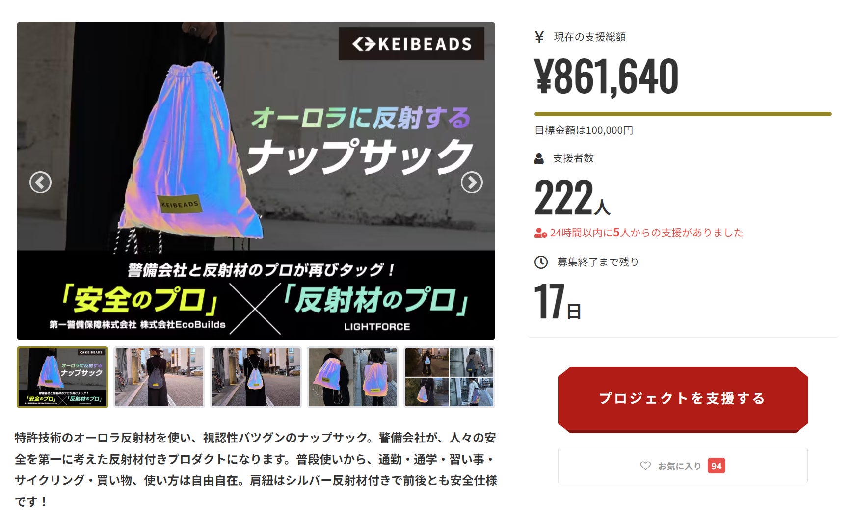 KEIBEADSの荒木です。目標の850%を達成することができました!!皆様、ありがとうございます。次は1000%目指してSNS頑張ります!反射材を違和感なく身につけれるプロダクトを、警備会社と共に今後も企画していきます。今回のプロジェクトで知っていただいた方も、これから追いかけていただけると嬉しいです。