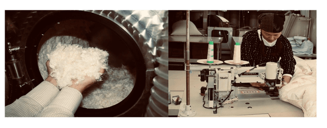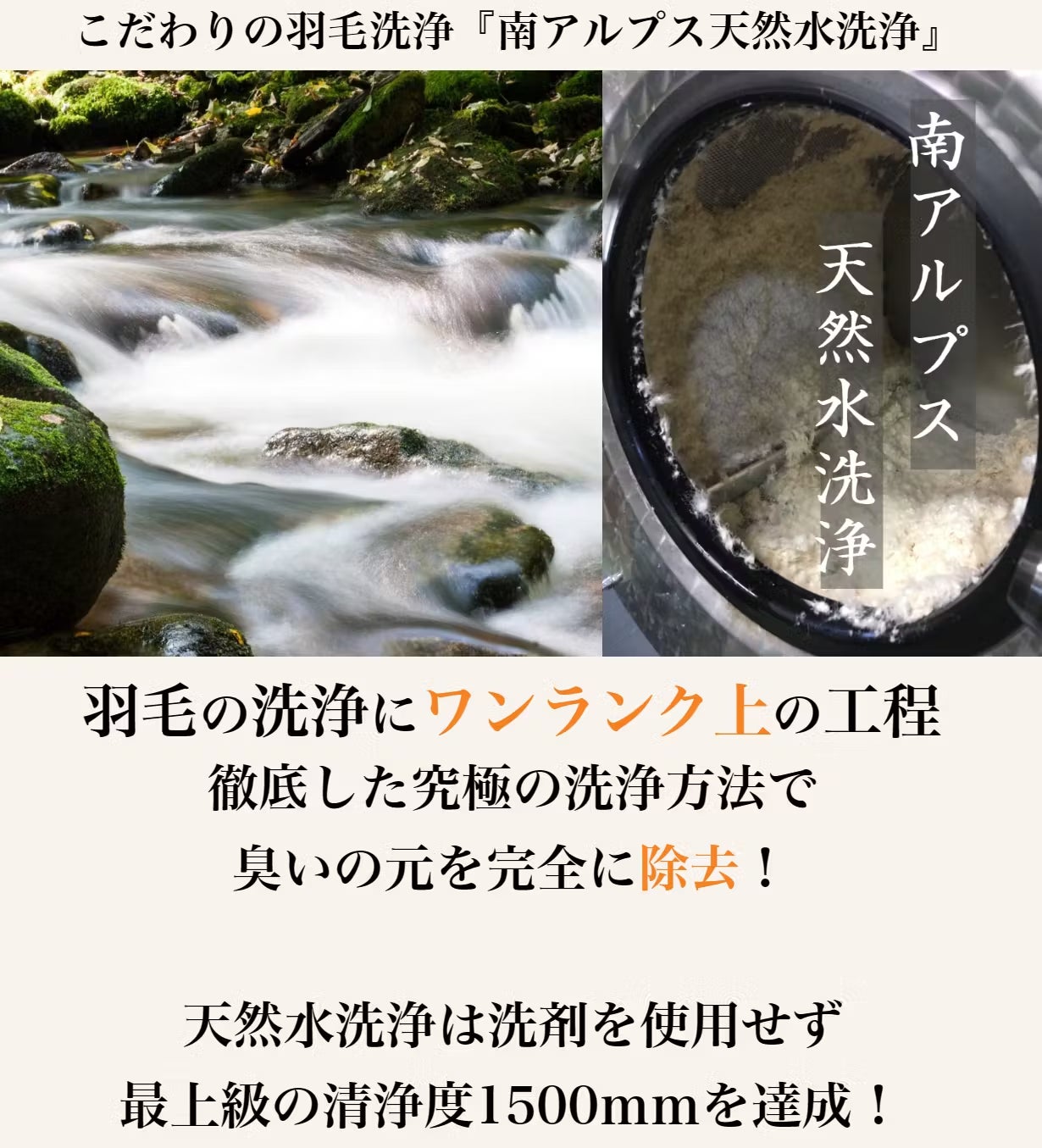白州工場がある山梨県白州町は国内でも有数の水の郷で、多くの食品会社の拠点がございます。甲斐駒ケ岳より浸透し、数十年掛け湧き出す地下水が世界的に見ても珍しい超軟水のため洗浄に優れている水質です。 さらに約40度の温度まで温め羽毛洗浄に使用しています。たっぷりの天然温水を使用することにより、洗剤を使用しなくても【JIS】規格のさらに上の清浄度1500m以上を達成しています。