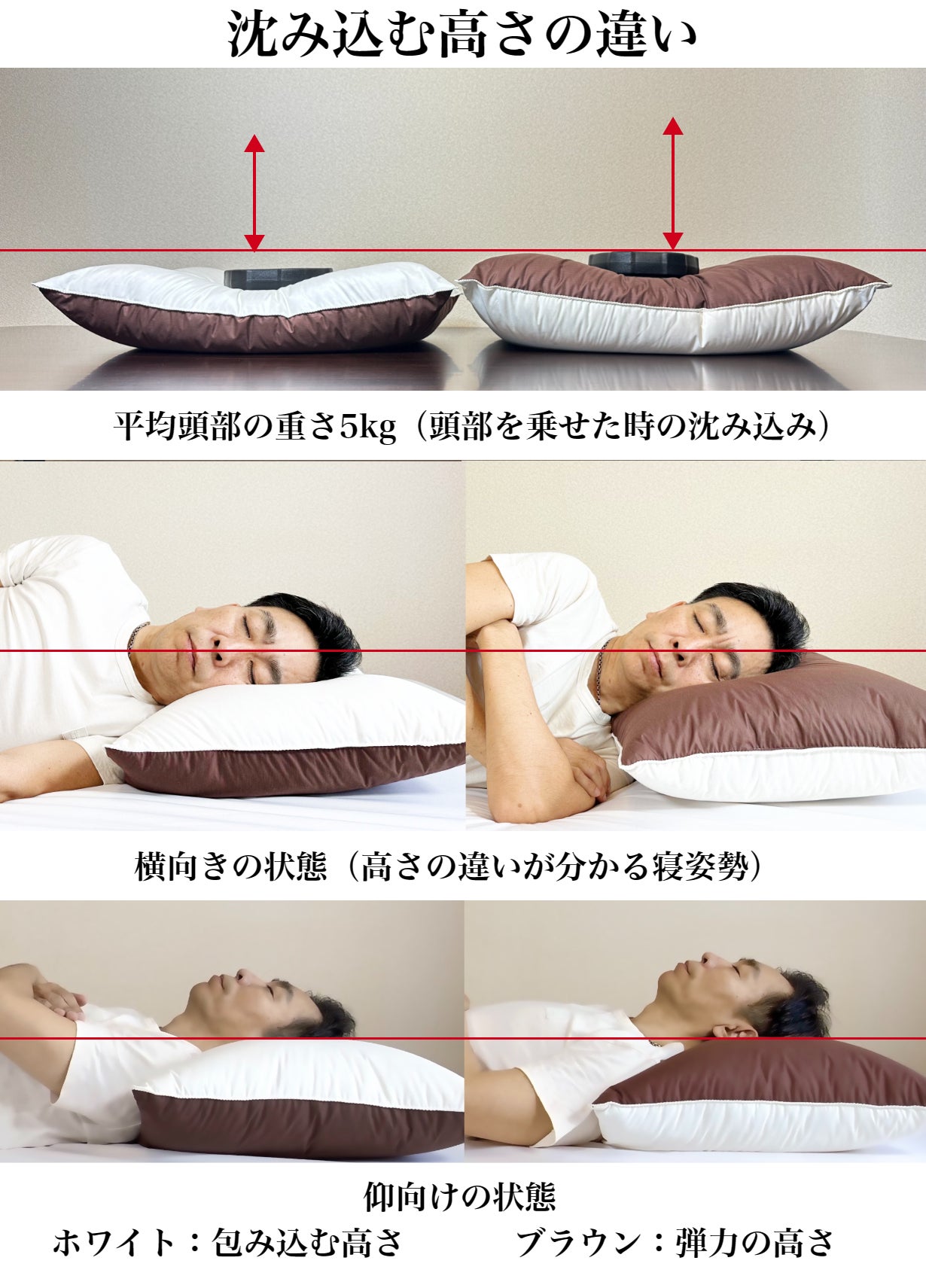 沈み込む高さの違い『男性頭部約5㎏:約3㎝の高さの違いがあります。』