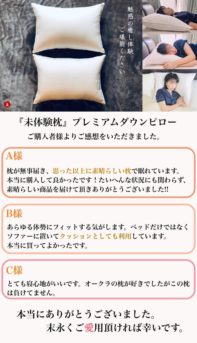 弊社ダウンピロー『未体験枕』・プレミアムダウンピロー