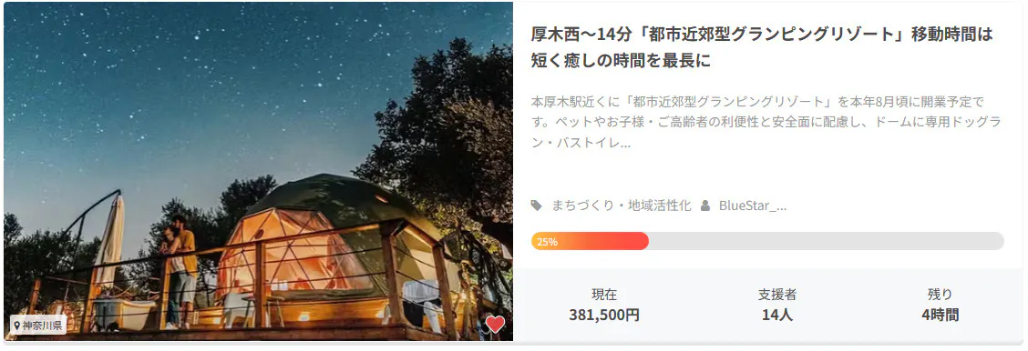 珍しい「都市近郊型グランピングリゾート」へのご理解を頂き、スポンサーとなってくださった協賛企業様に大変感謝しております。またお取引銀行様におかれましては、これまで前例のない「都市近郊型グランピングリゾート」へのご融資に興味をお持ちいただき大変感謝しております。