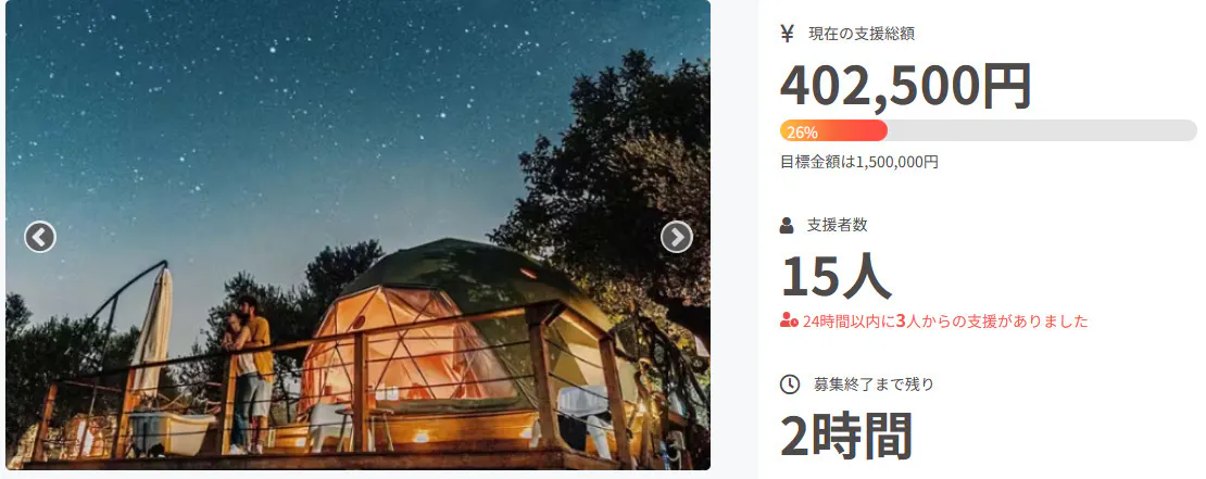 そこで様々なご意見を賜り、より快適な滞在をお約束するための取り組みを行ってまいります。ご支援いただいた方々には、開業後のグランピングリゾートで特別な体験をしていただけるよう努めてまいりますので、何卒沢山のご支援を賜ります様お願い申し上げます。