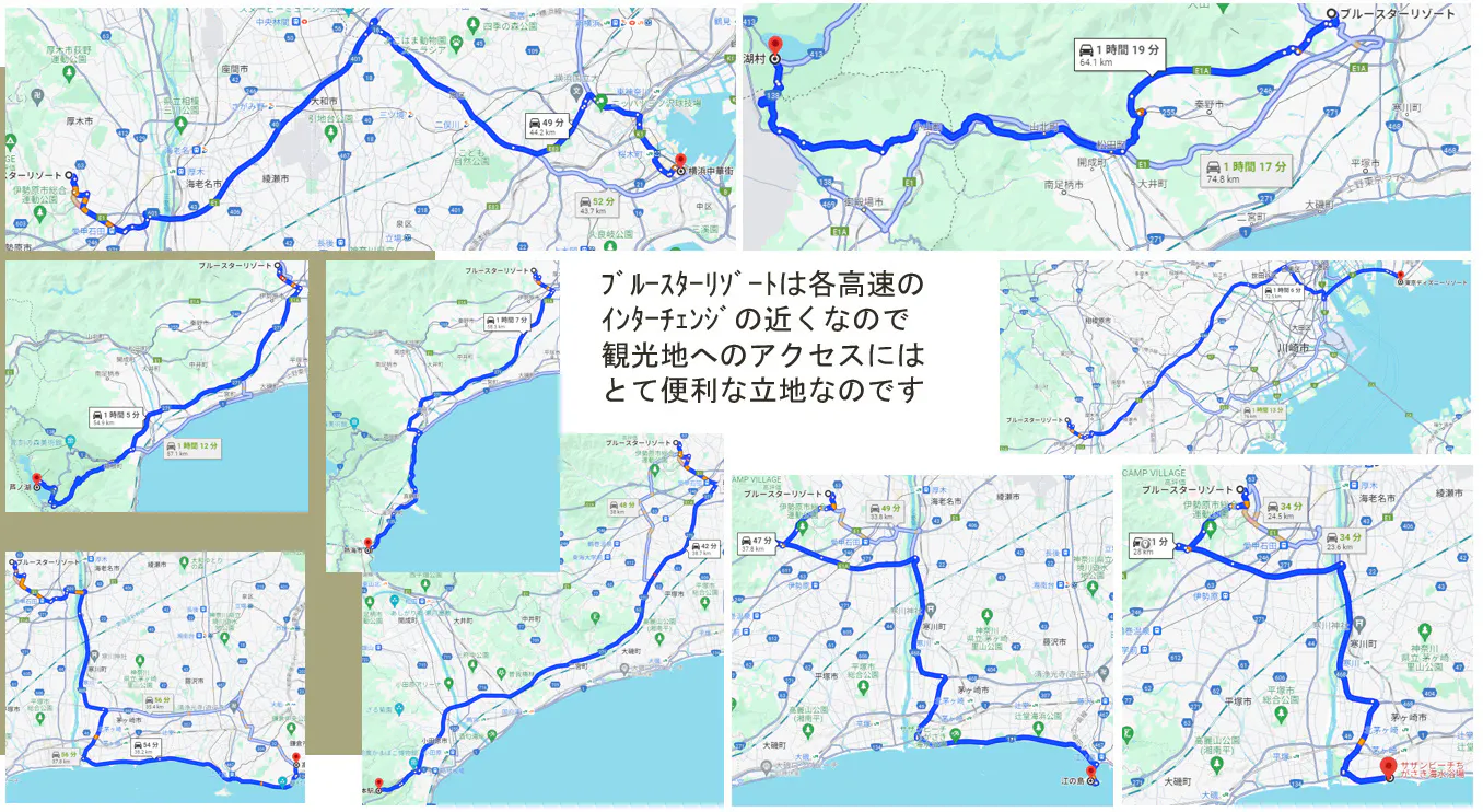 とても小さな経路図画がちりばめられた画像ですが、これはグーグルマップの経路検索にて、当リゾートの位置から有名な観光地までの時間と距離を検索した結果です。