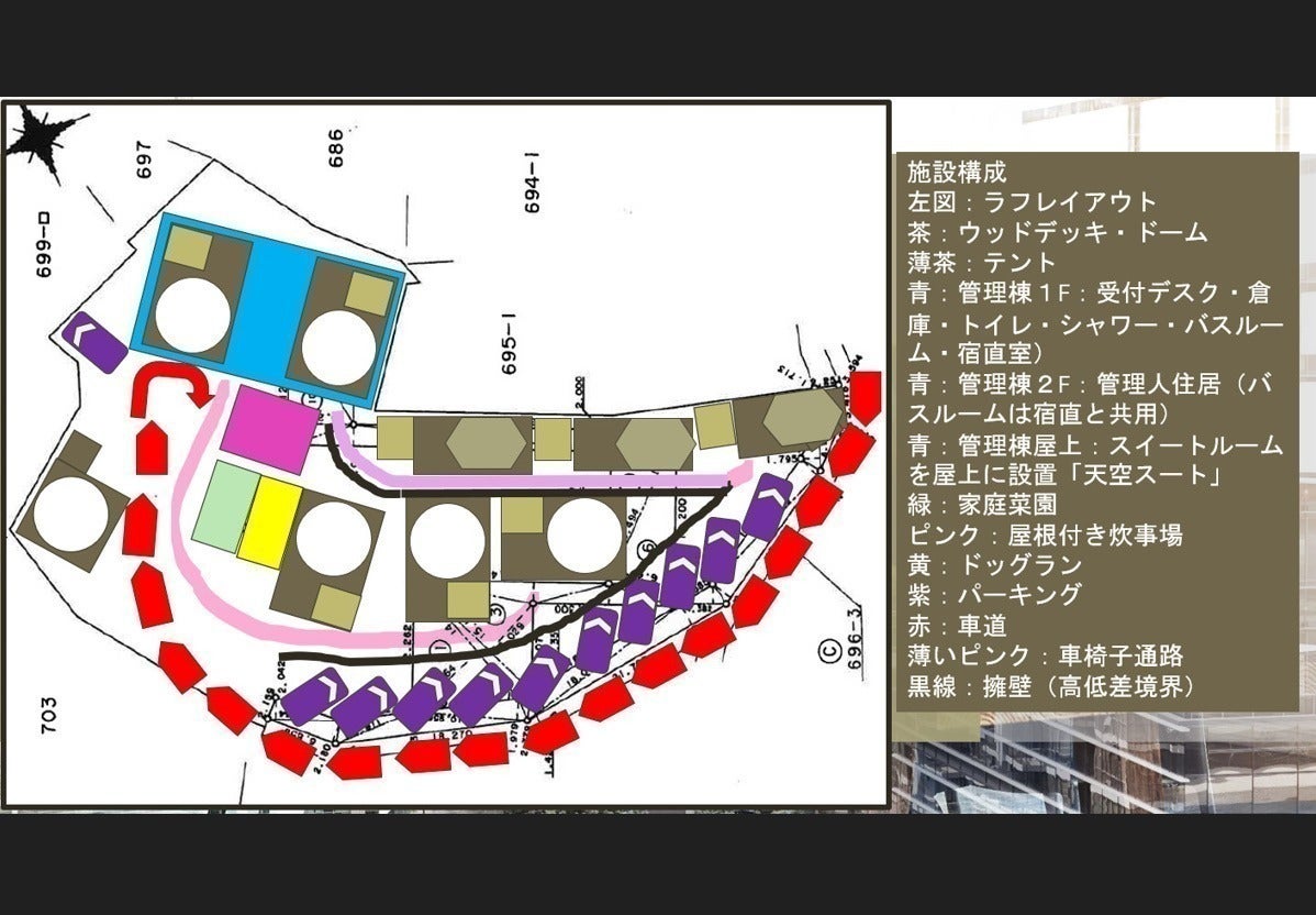 支配人は目の見えないハスキー犬を約11」年間介護しながら共に暮らし、介護資格保持者も持っております。また障害をお持ちの方やご高齢の方も積極的に現地採用予定。地域の雇用創出にも貢献したいと考えております。多くのグランピング施設ではドーム内にトイレ設備がないことが多く、水回り関係が別棟で不便との声も多く聞かれます(一度は体験してみたけれどその点が不満でリピートはないかな・・の様に)そこで当施設では通常より大きめのドームを使用することで、ドーム内にバスルームを設け利便性を改善いたします。また、あえて厨房設備は設けず調理人の人件費や固定費を削減し宿泊費用を抑え、地元のお店自慢のお料理をお取り寄せする等地域に密着し共存することを優先いたします。もちろん手ぶらでBBQを楽しんでいただくことも可能です。