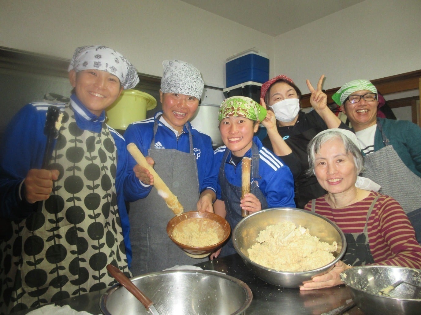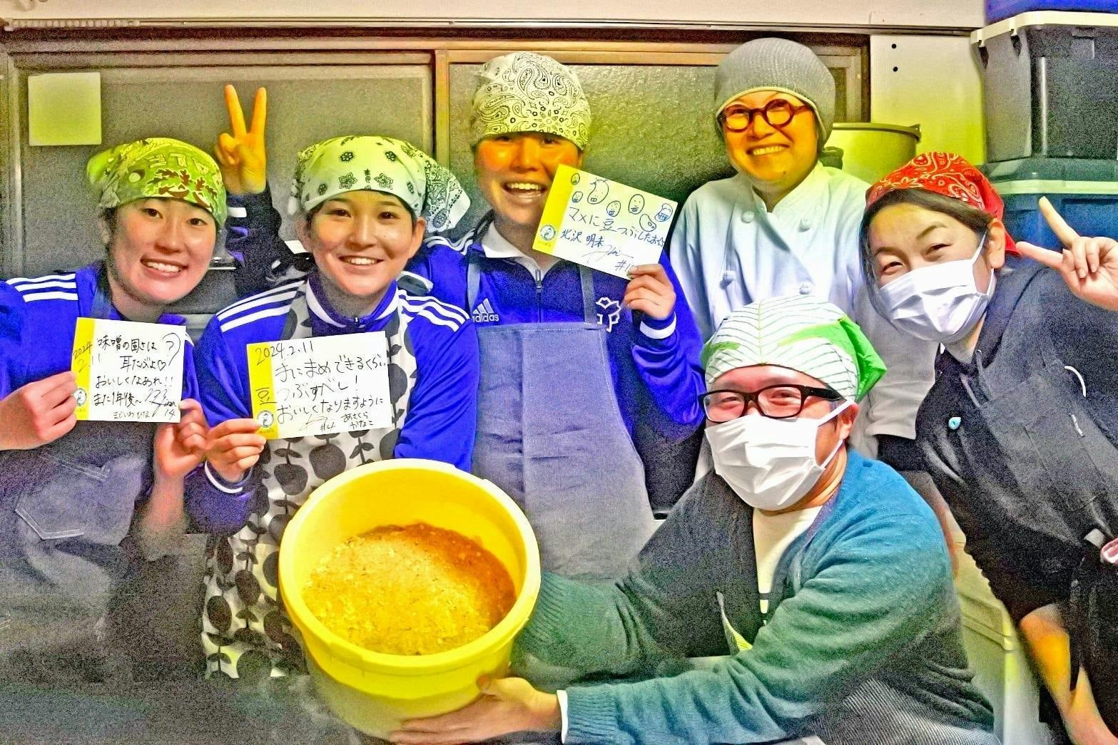 地元のキッチンカー「コマデリ」さんとの協力で、日体大SMG横浜は毎年味噌作りを楽しんでいます。今年も大成功しました!先輩方の伝統の味噌を混ぜることで、深い味わいが生まれます。