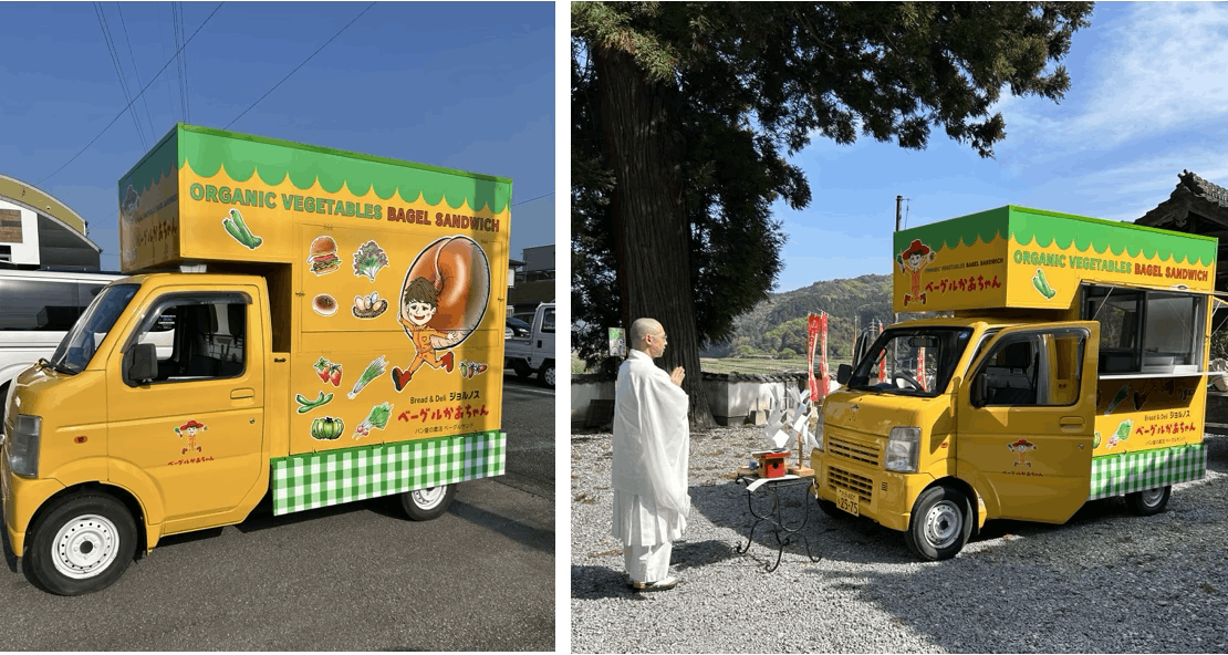 完成したキッチンカーとお祓いの様子