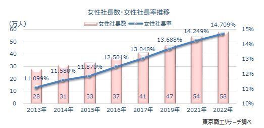 2013年、女性経営者数は28万人だったのが→2023年、58万人に増加
