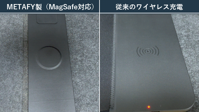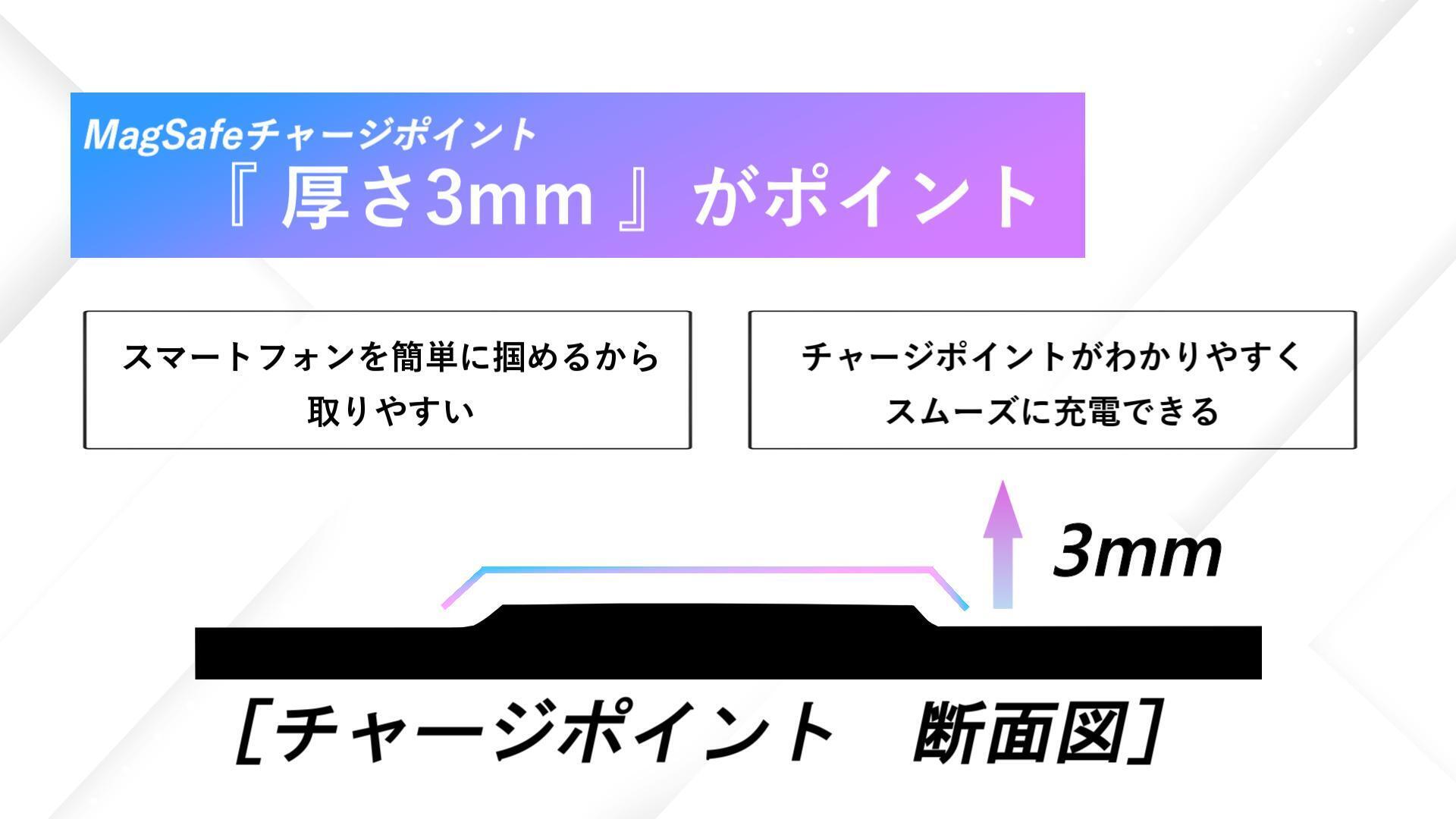 これにより片手でスピーディーかつスムーズにスマートフォンを取り外すことができる。細かなポイントであるが、この3mmの凹凸がなければ、スマートフォンをMagSafeから取り外すことが難しく、面倒になるのだ。