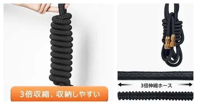 水を通すとホースが3倍の長さに伸び、水を抜くと即座に収縮します。片付けも簡単です。