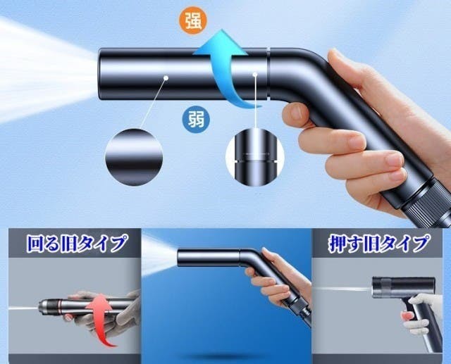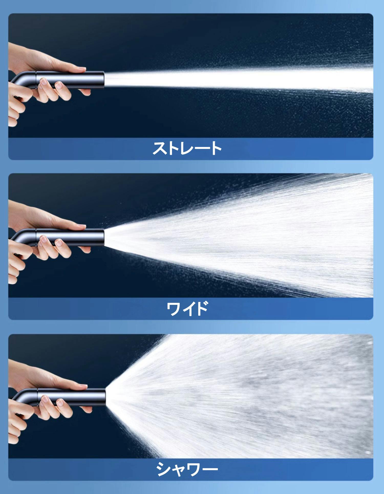 ノズルの前部を回すだけで水の放出が始まり、さらに回すとモードを自在に切り替えることができます。高所や遠くの場所、狭いスペースや低い場所など、様々な状況でご利用いただけます。