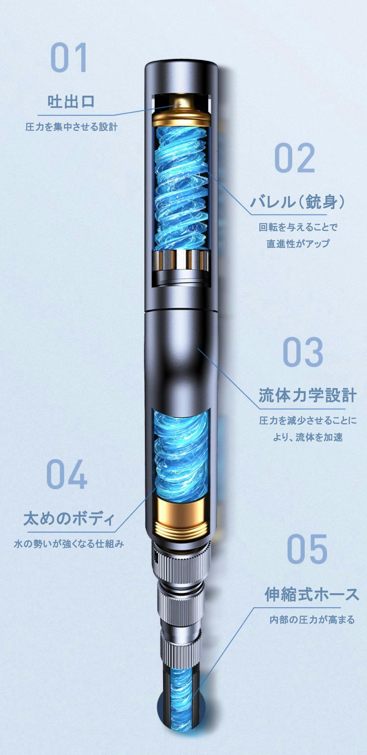 ホースの高い伸縮性により、自然な動力が生まれ、ノズル内のタービンが水流を加速します。水が渦を巻くことで水圧も向上します。