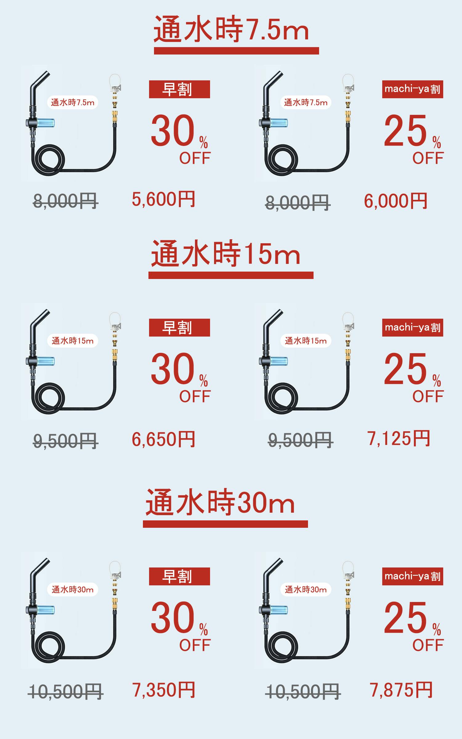ホースの長さ:通常2.5M/5M/10M ⇒ 通水時7.5M/15M/30M
