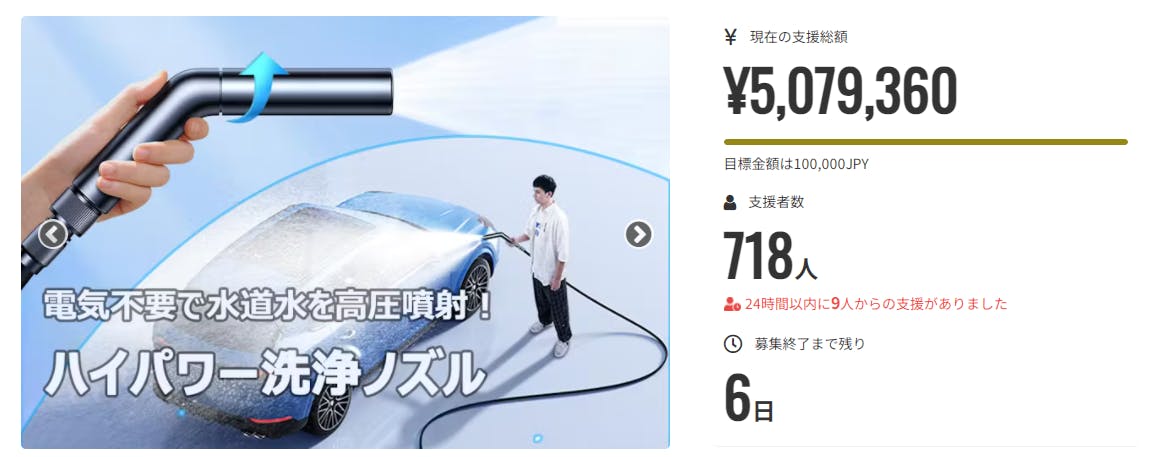 2024/05/20 11:10皆様のご支援に心から感謝申し上げます。「散水や洗車にも使える!電源不要、回すだけで水圧が調節可能な洗浄ノズル 」プロジェクトへの多大なるご支援、誠にありがとうございます。プロジェクト終了まで残り6日間となりました!!!ここまで、応援していただいまきました皆様には本当に感謝しています。本当にありがとうございました。残り、少しになりましたが、最後まで気を抜かずに頑張っていきますので応援及び拡散を宜しくお願い致します。 もっと見る