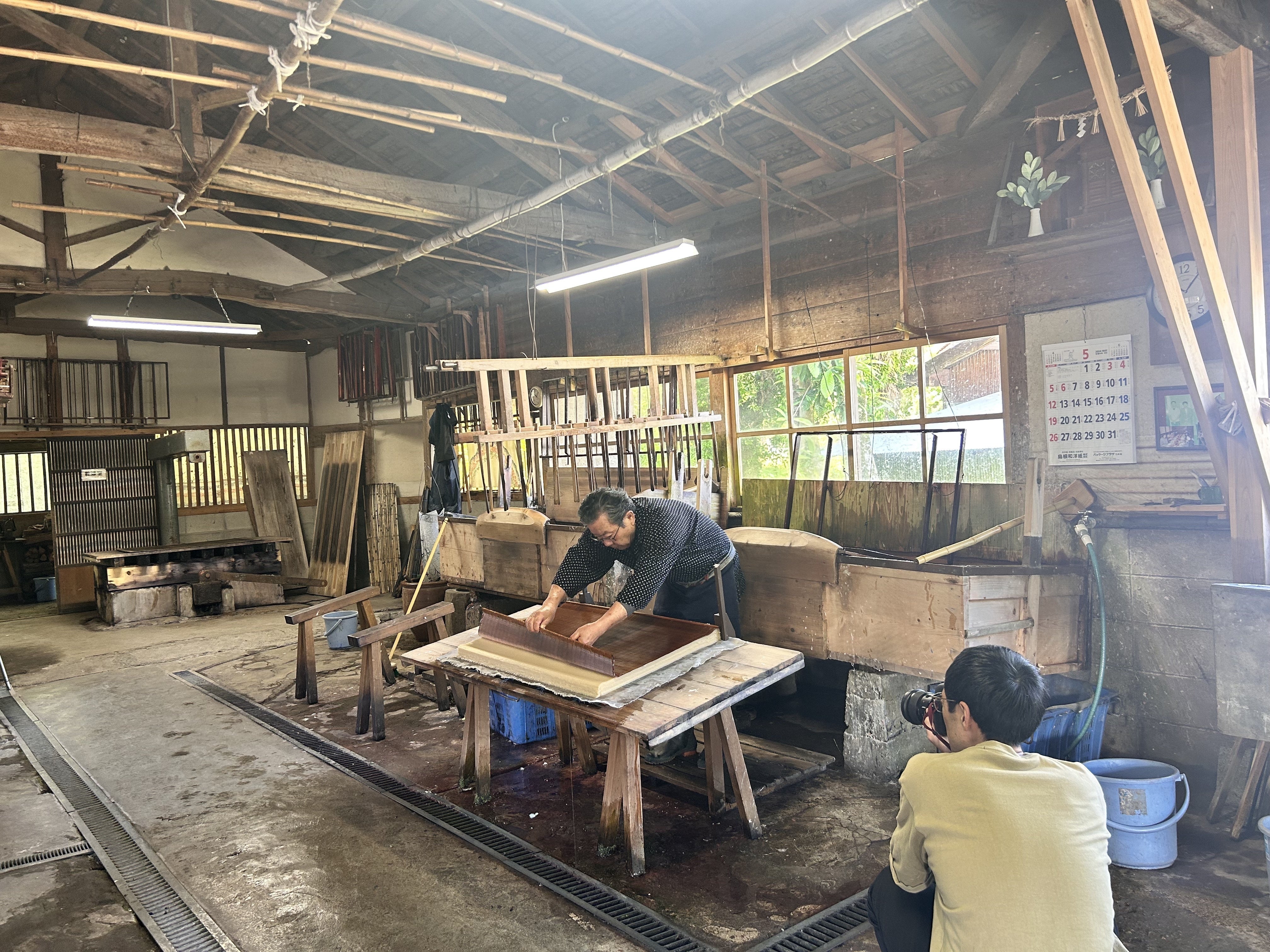 今日は仕事道具を紹介します!島根県松江市八雲町という山に囲まれた場所に出雲民藝紙工房はあります。そこには榮四郎が使っていた道具が今でも現役だったり、残されていて、もしかしたらふらっと紙漉きに本人が現れそうです。写真は糸巻きという道具。漉いた紙を重ねるとき、後で剥がしやすくするために一枚ごとに糸を這わせます。よくよく見ると数字が貼ってあるのがわかりますか?これは色の数。出雲民藝紙はとても細かく色が作られています。ちぎり絵の表現がしやすいようにと榮四郎は緑だけでも10色以上作っていたそうです。今は色の数が少し減りましたが、それでも色彩豊かな紙は健在です!今回制作の和紙の本にも色見本をつけます。ぜひ色の多さにも注目してください!