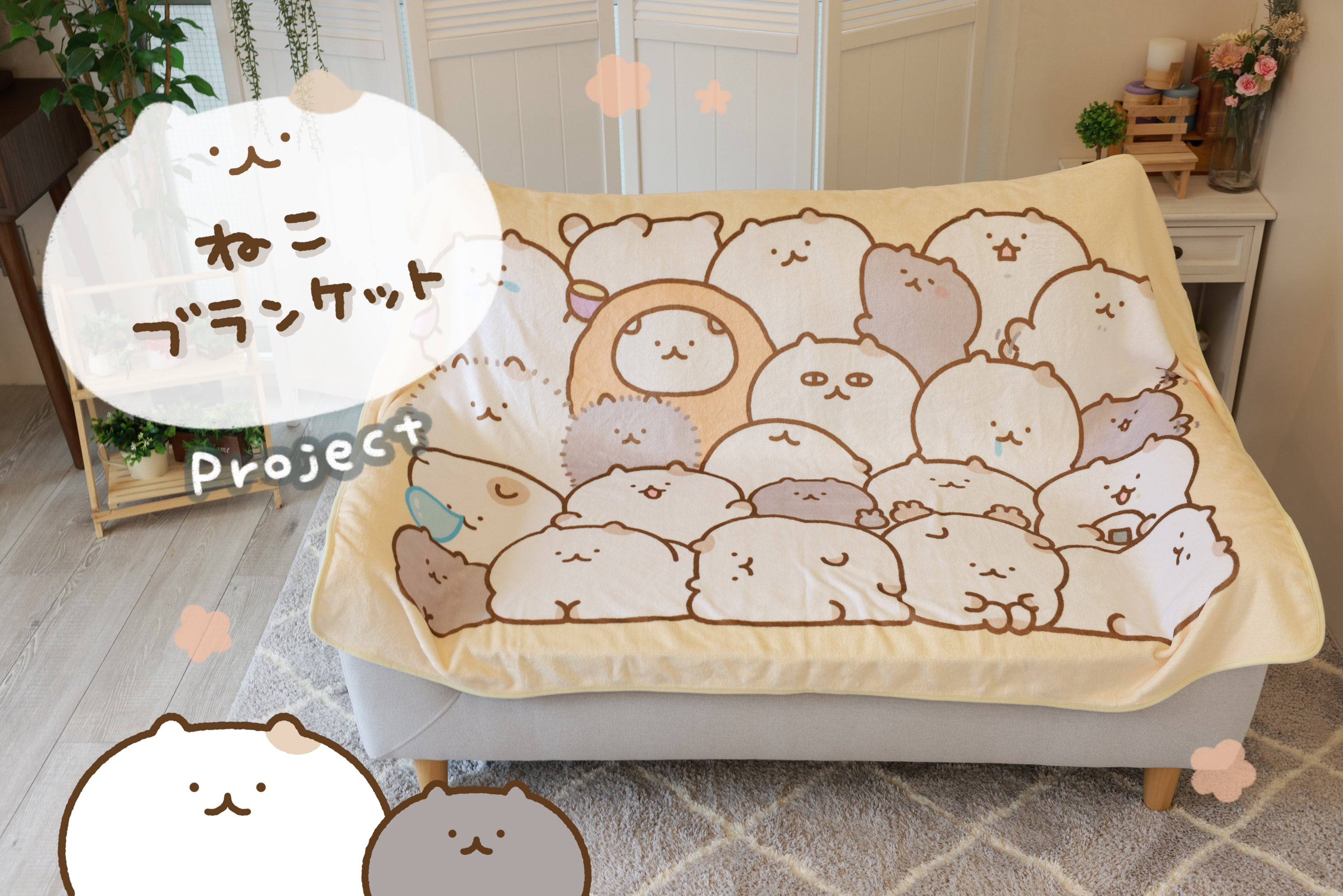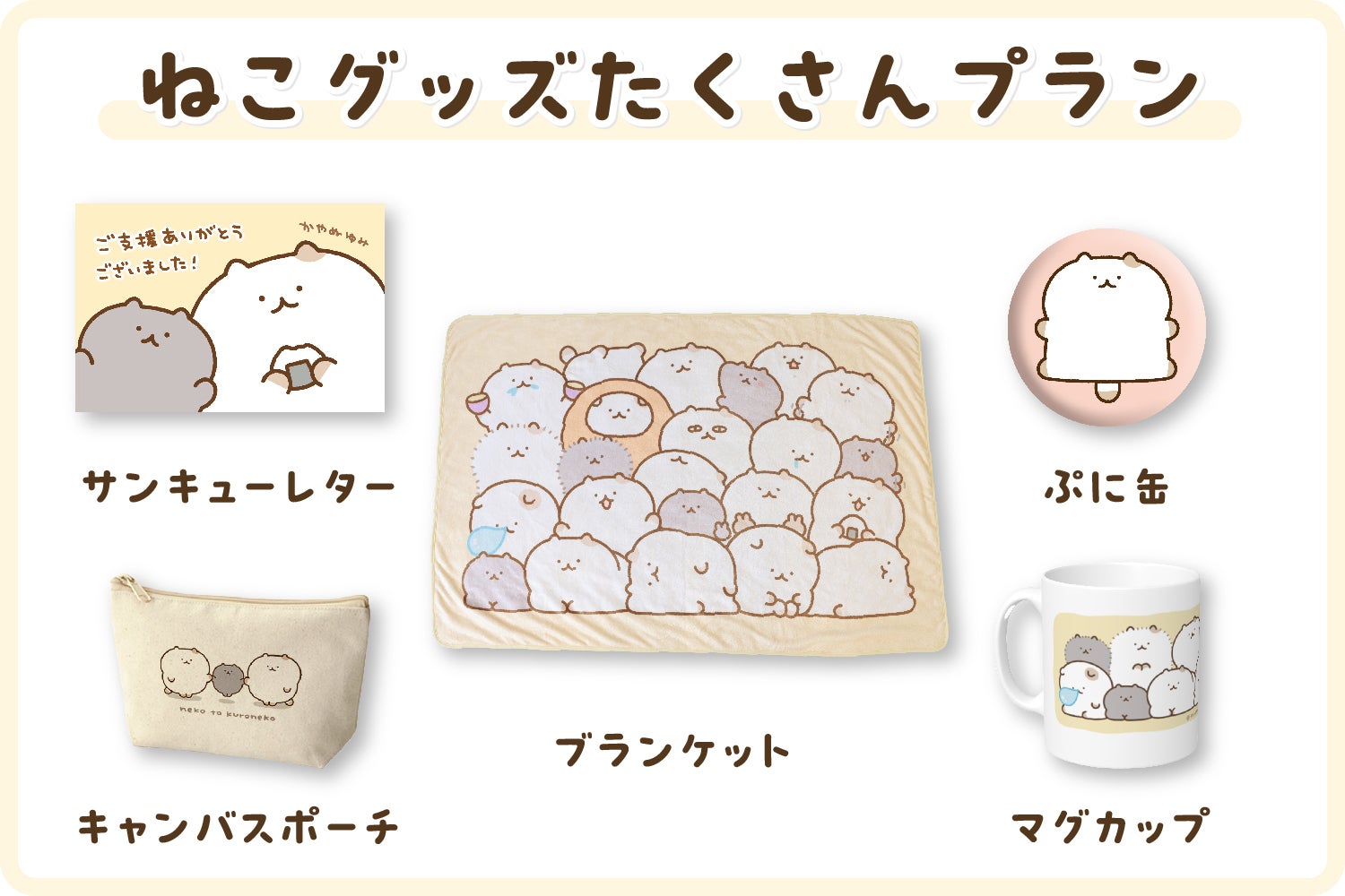 ねこのお腹をぷにぷに出来るぷに缶や、ブランケットとおそろいデザインのマグカップなど、