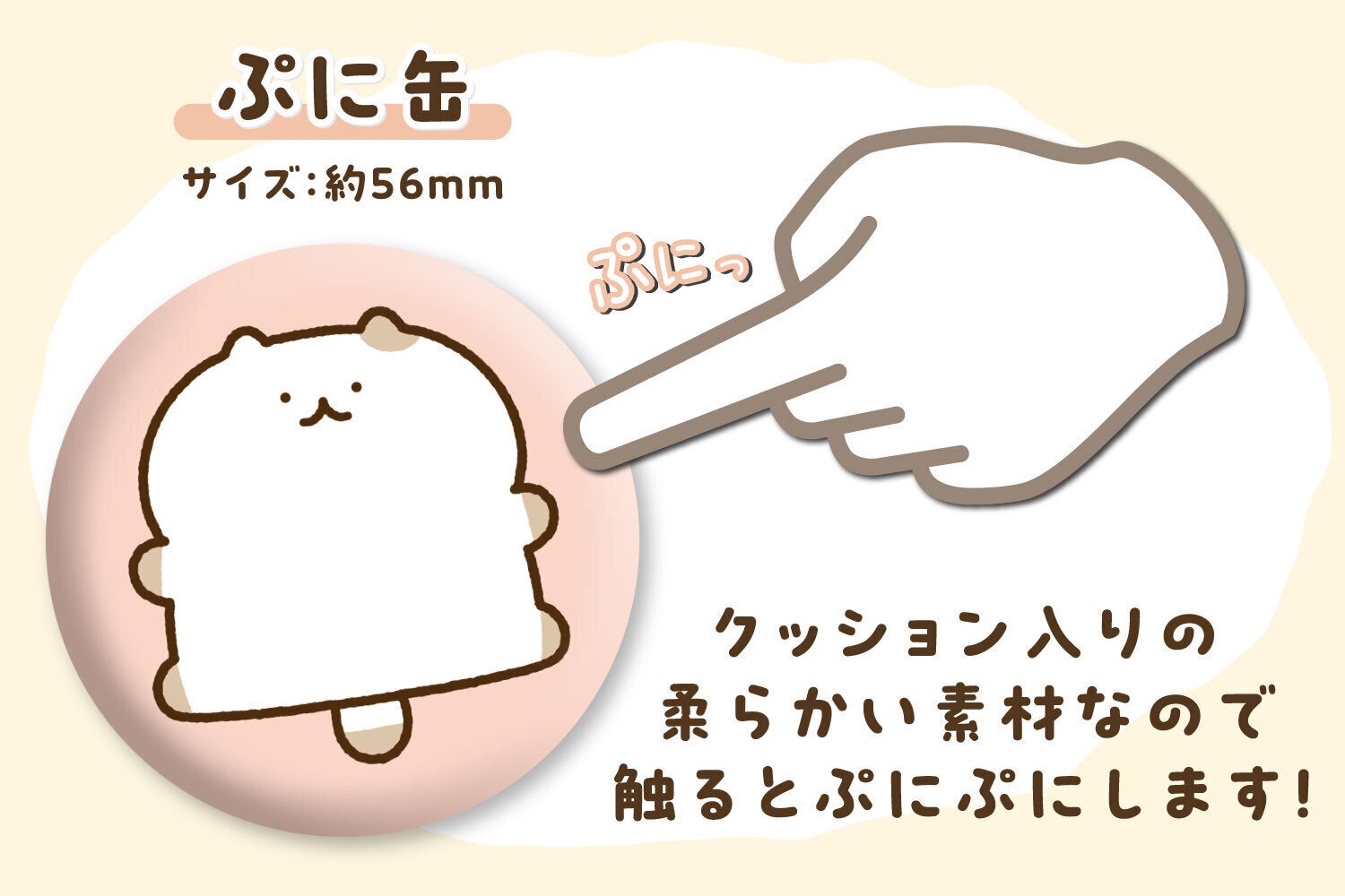 ぷに缶の写真のサイズ説明に約56㎝とあるのですが、これは56㎜ではなくて本当に56㎝なのでしょうか。てっきり缶バッチ的なものを想像していたのですが、クッションぐらいの大きさということでしょうか?