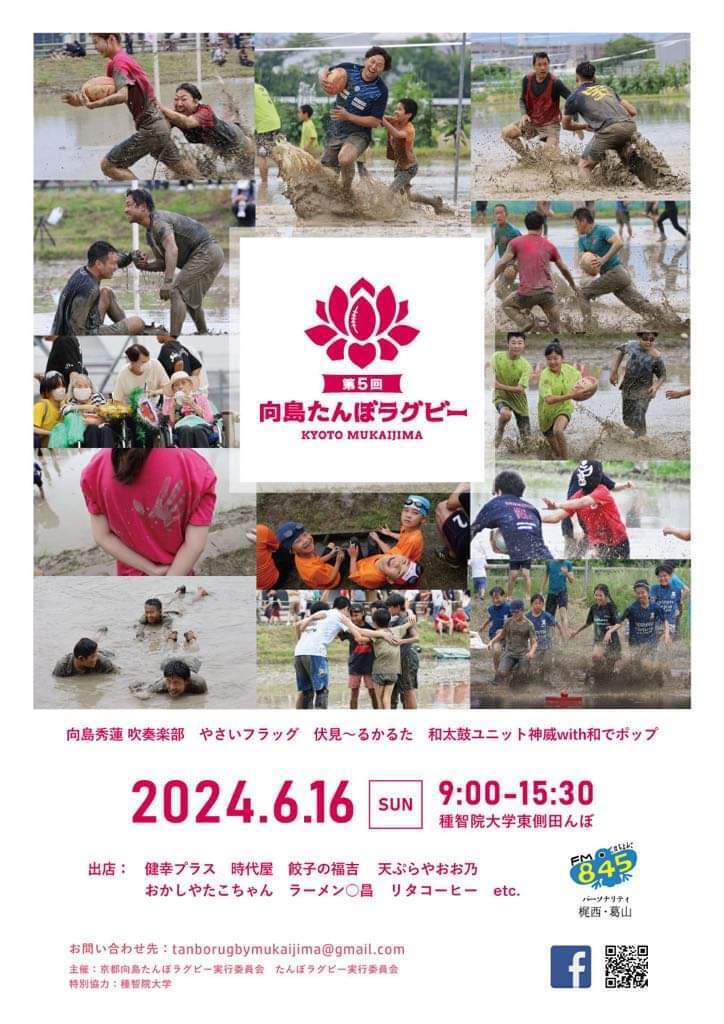 ちびっこからご年輩まで、経験問わず参加出来る。発祥は京都福知山。6月に行われる京都伏見の一大イベント。たんぼラグビーin京都向島。出場チームが出揃った様です。たんぼラグビーはボールを持つ、パスする、走る、たんぼに飛び込む。それだけ。大会の大成功を願います。少しですがご協力させて頂きました。こちらのプロジェクトも少しご紹介頂く予定です。