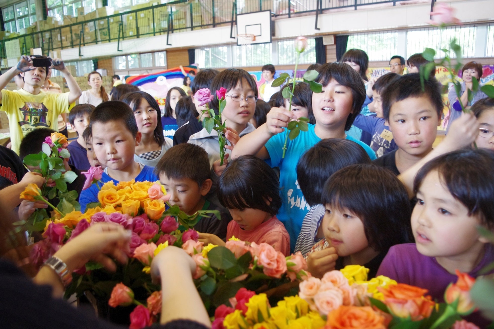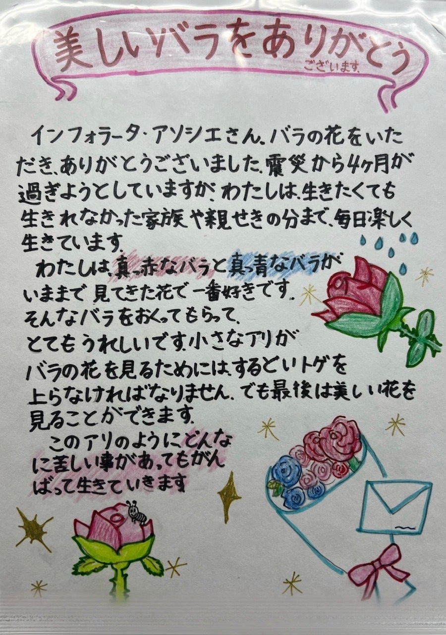 2011年、バラを届けた被災地の小学生からお礼の手紙が届きました。その中の1枚の手紙に心を奪われ涙が止まりませんでした。家を失った、家族を失った、友人を失った、ふるさとを失った。被災された方々の思いに立った支援が必要だと実感しました。“頑張れ!”ではなく、蕾が花をひらくような、1匹のアリが険しいトゲを乗り越えて、美しいバラの花を見ることができるような、そんな明日への希望が必要なんだと心を打たれました。