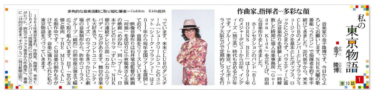 東京新聞の連載「私の東京物語」。当プロジェクトの音楽プロデューサー 金子隆博の物語が今日からスタートしました。是非ご覧ください。