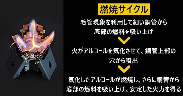 毛細管現象によりアルコールを吸い上げ、熱してから気化まで早く、また燃料の量には左右されません。