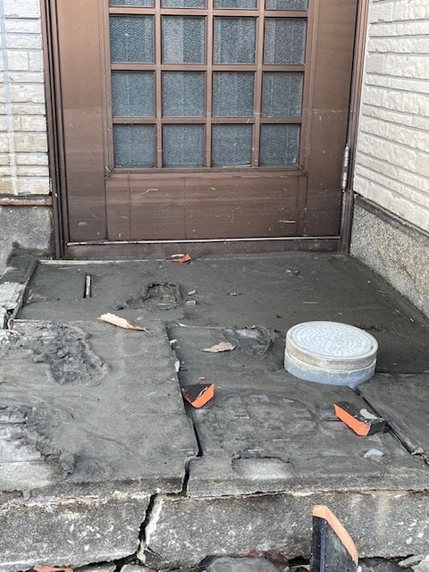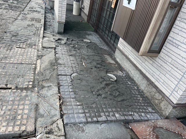 建物が沈下した影響で若干の傾斜が見られるため、排水がうまく出来ない・扉が開かない等の影響が出ています。