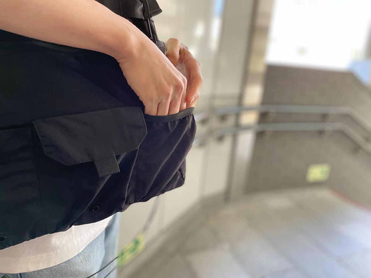 収納力があるにもかかわらず、とにかく軽くて薄い!前掛けスタイルでも邪魔になりません。