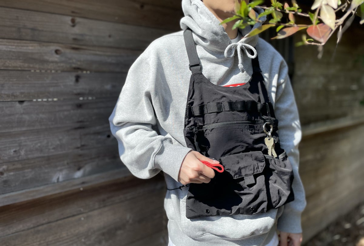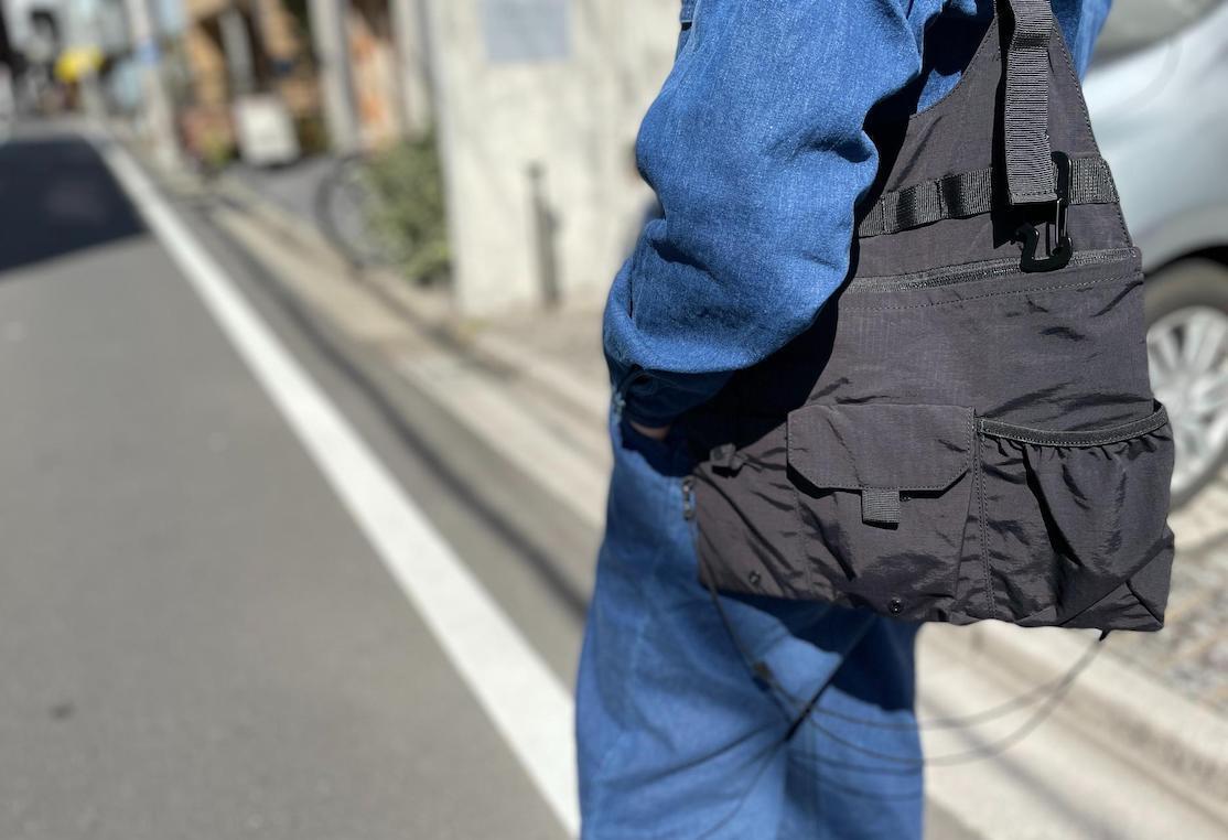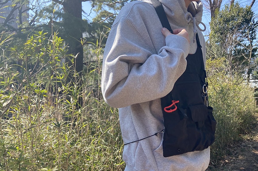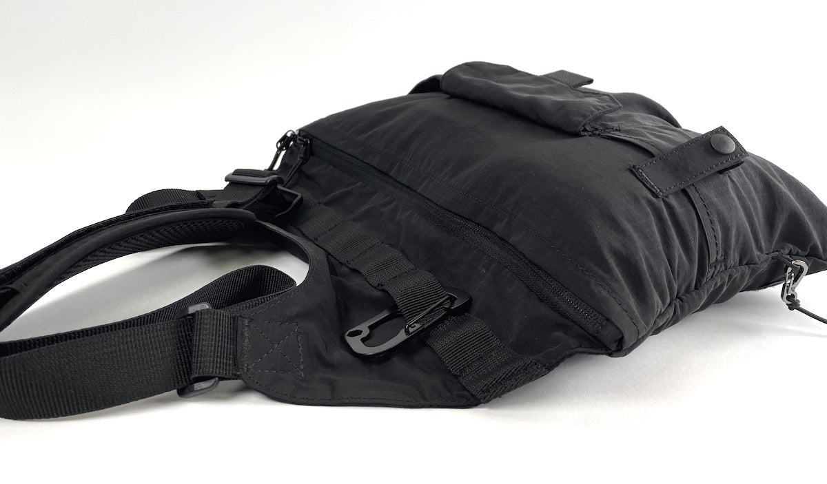 どんなコーディネートにも合わせやすい、リップストップナイロン地のブラックカラーを採用。ミニマルなデザインだからこそ、普段着に合わせても違和感がありません。