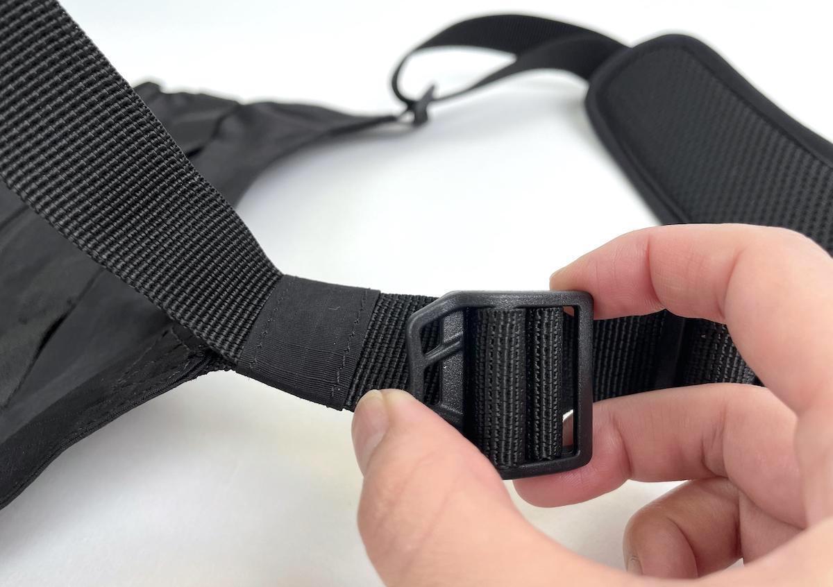 カチャっと差し込むだけのアジャスター仕様で、腰ストラップを着けても着けなくてもカスタマイズが可能。