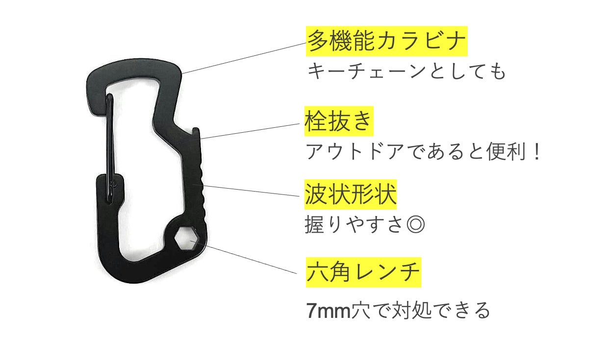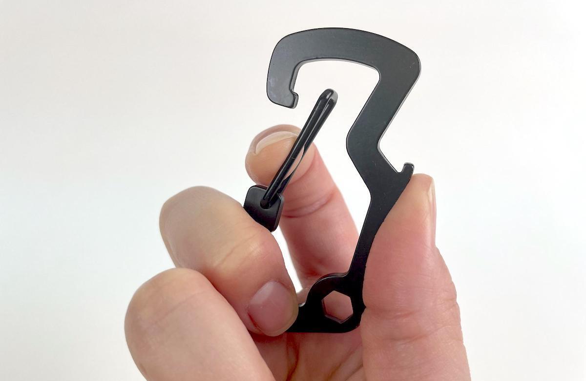 購入時は、こちらの「マルチツールカラビナ」が一つ付属します。カラビナとしての役割はもちろん、何役もこなしてくれるスグレモノ。