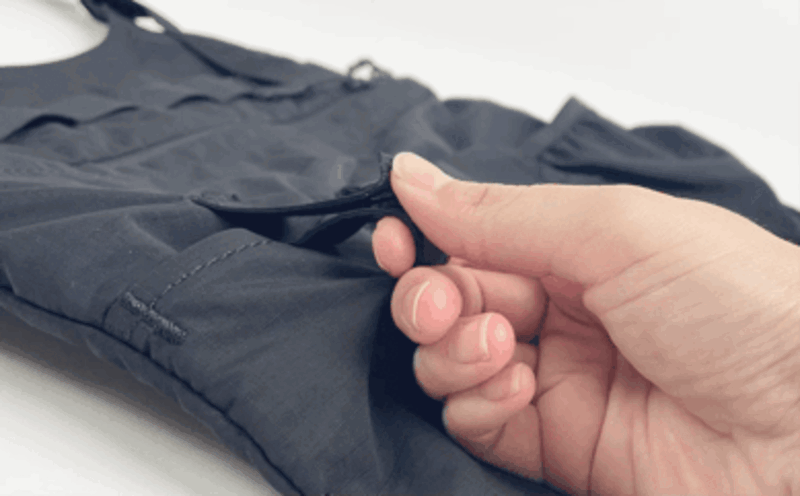 首部分のストラップは長さの調節が可能。アジャスターの取手部分をクッとずらしながら、ストラップの先を引っ張るだけです。