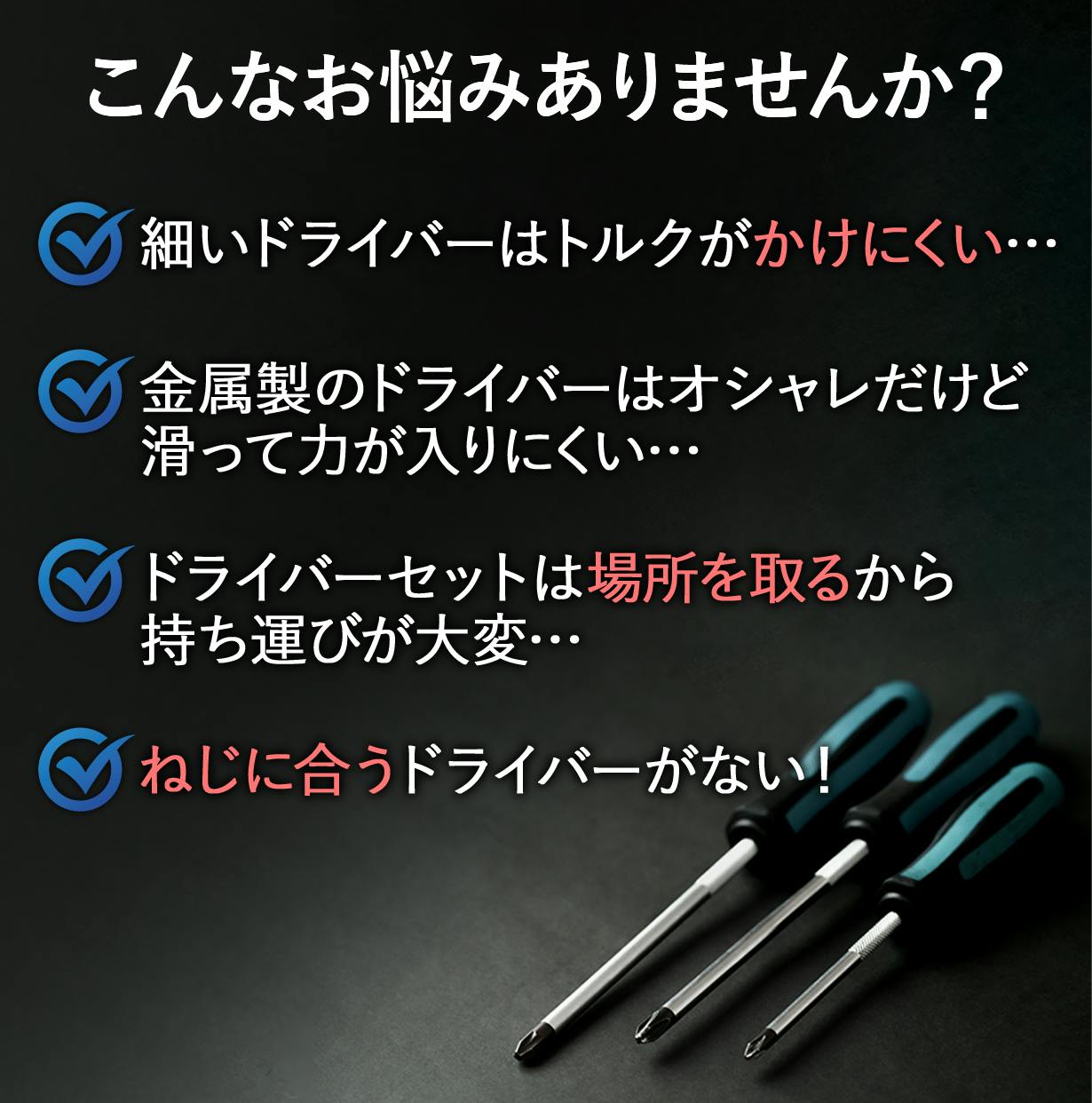 選択肢がたくさんあるからこそ、ただ使えるだけではなく「持っていてワクワクする」「デザイン性と利便性を両立している」ドライバーツールが欲しいと思っていました。