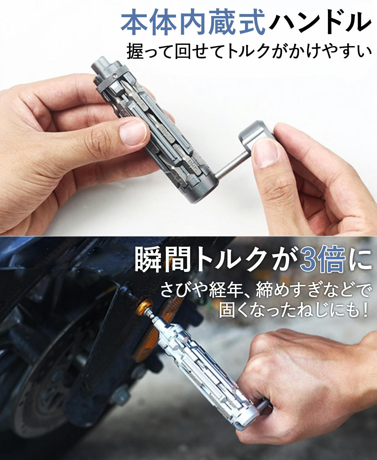 本体内部には内蔵式のハンドルがあり、引き出すだけで簡単にトルクをかけられます!