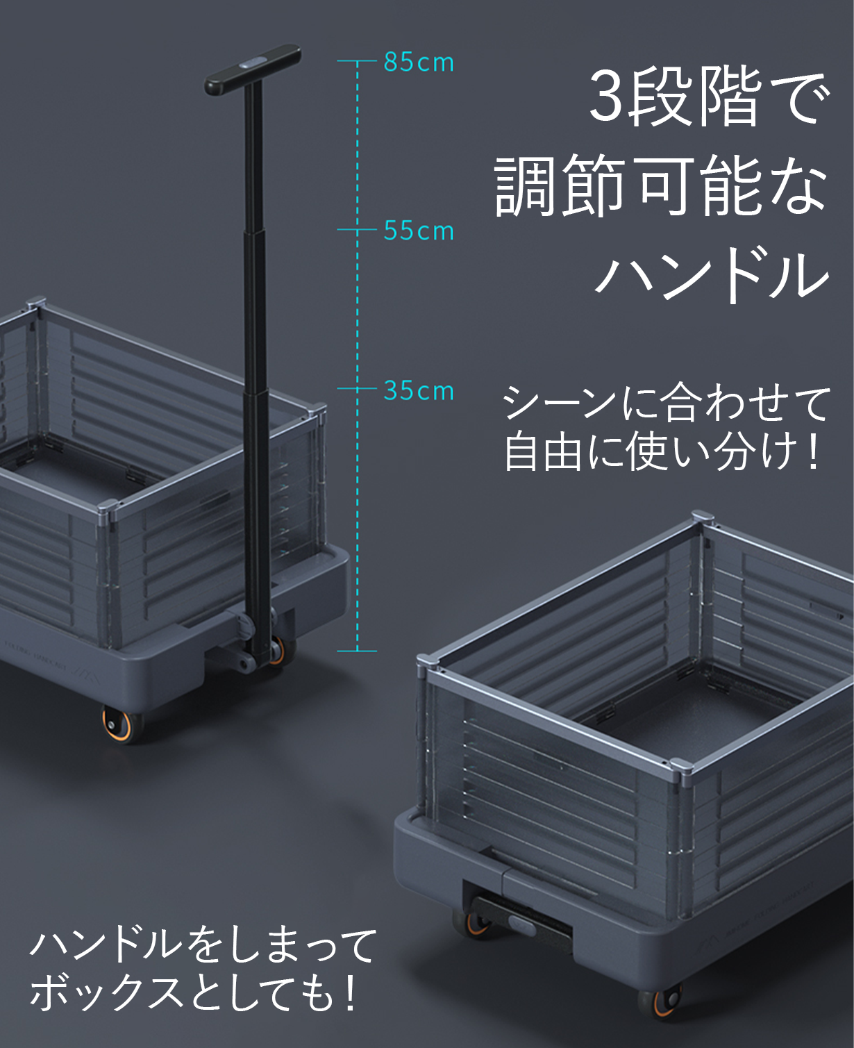 動かさない時は車輪をロックしてハンドルをしまえば箱状になるので更にコンパクトに!