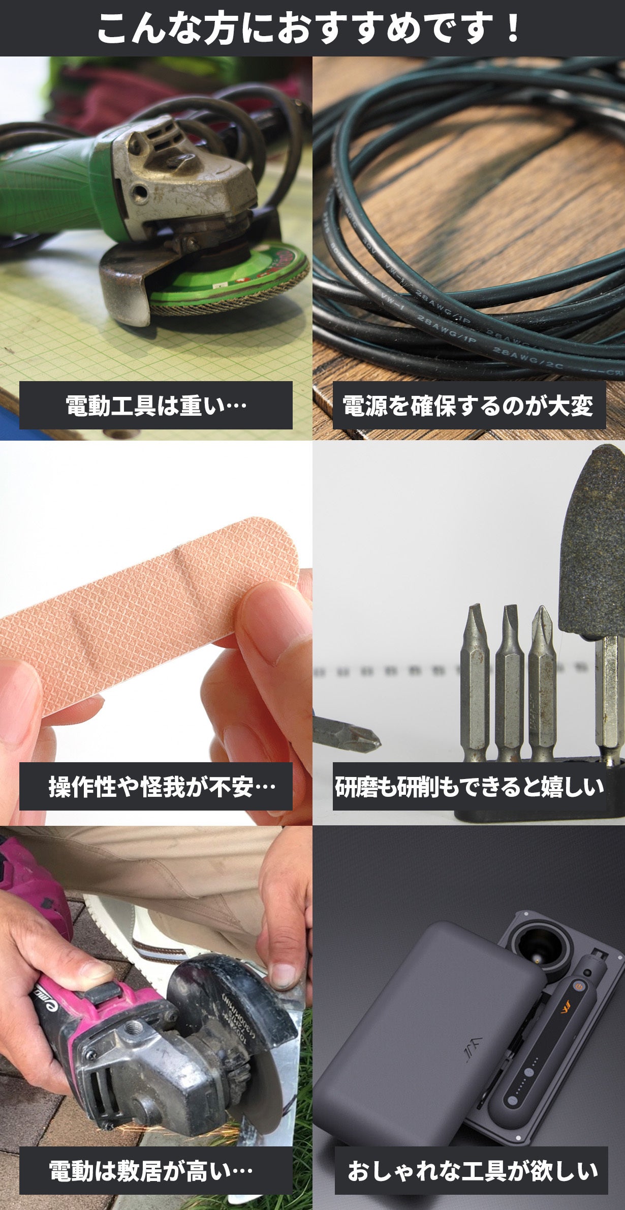 電動工具といえば無骨で物々しいデザイン、近所にも響き渡るような機械音というイメージがありますが本品は工具とは思えないスタイリッシュでコンパクトなデザインに加え、機械音をかなり抑えた設計が大きな特徴となっております。