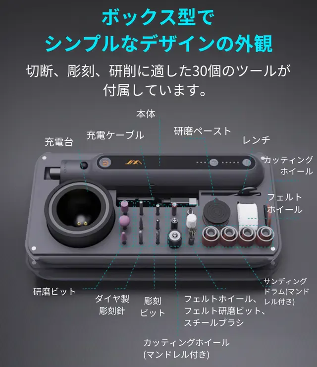 30個の便利なツールがコンパクトで軽量なケースに収められ、彫刻、穴あけ、サンディングなどの作業を外出先でも簡単に行えます。